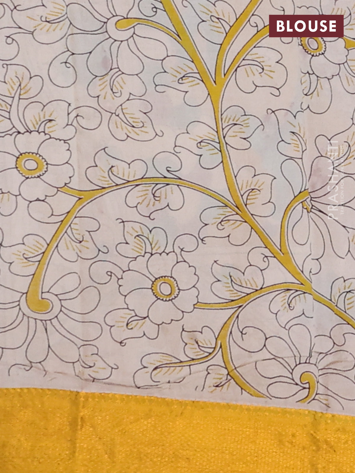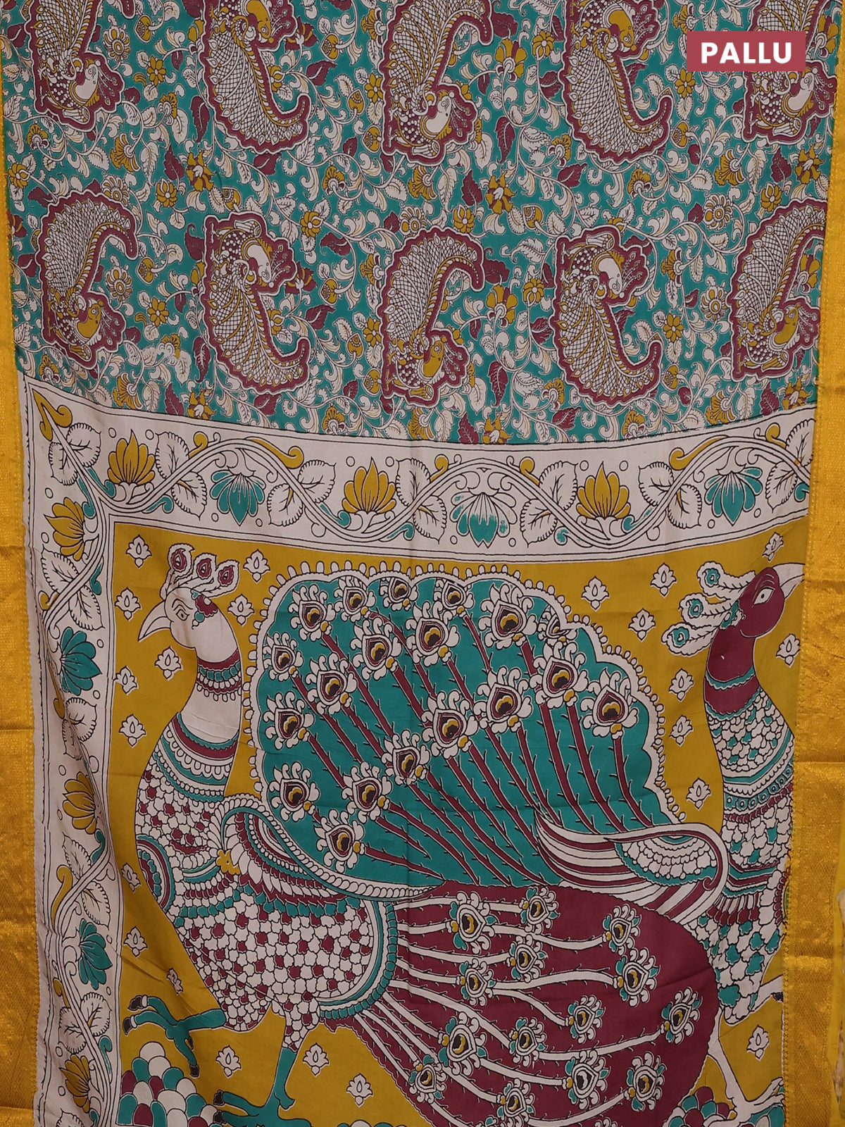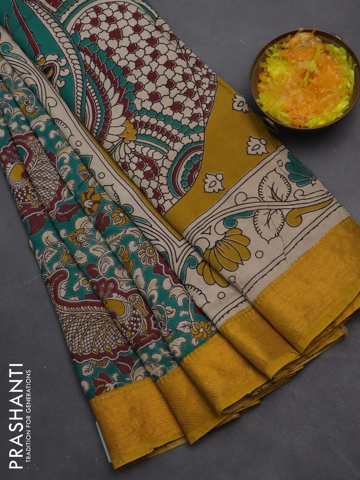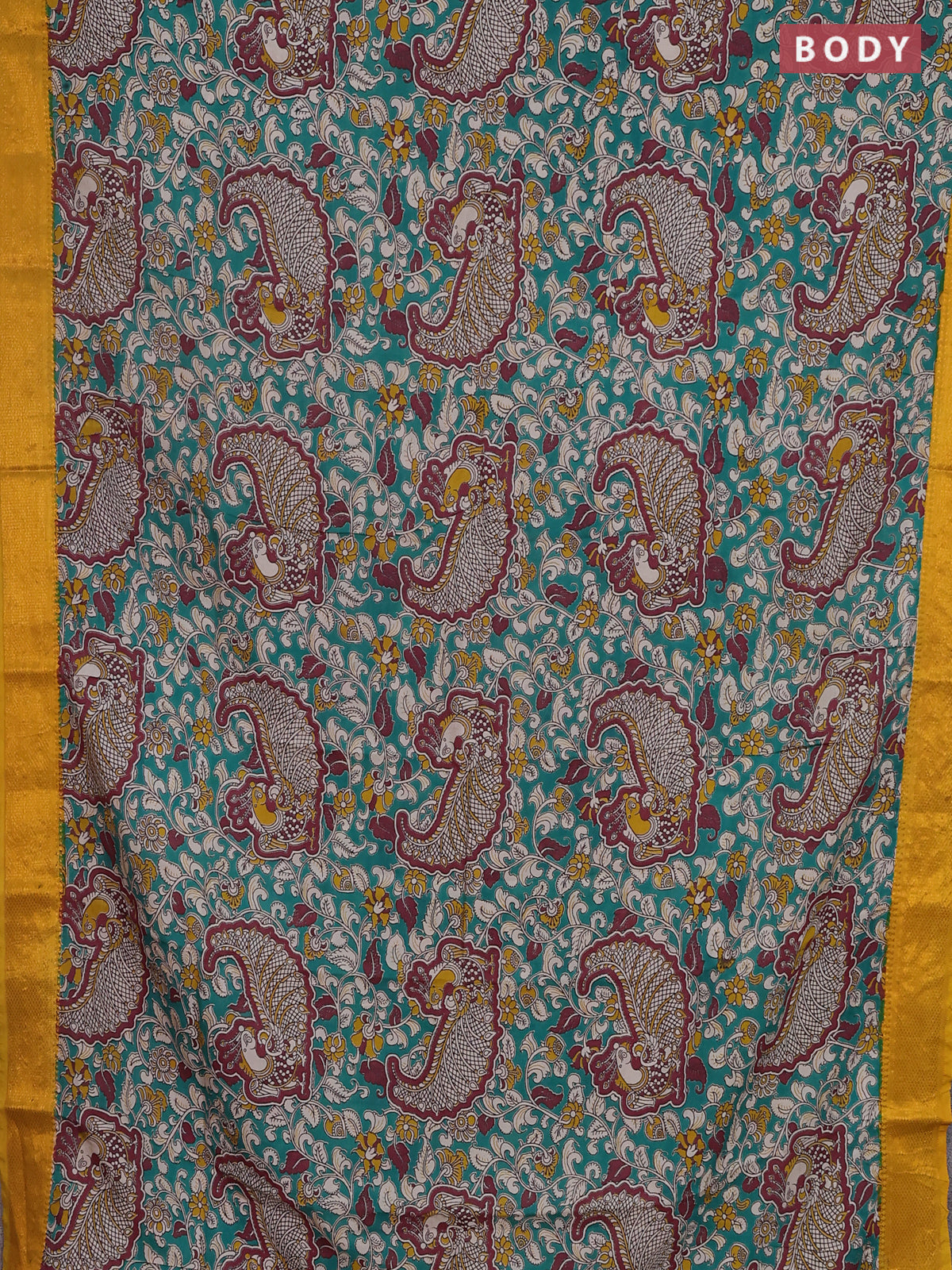 Kalamkari semi silk saree teal green and mustard yellow with allover prints and zari woven border