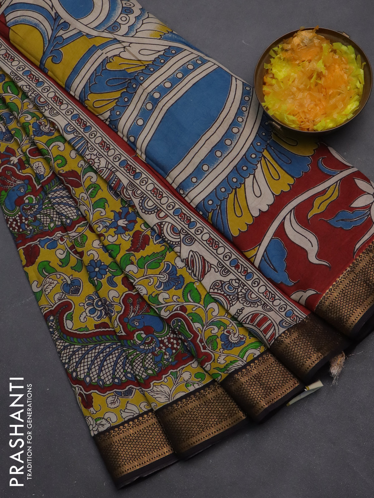 Kalamkari semi silk saree yellow and black with allover prints and zari woven border