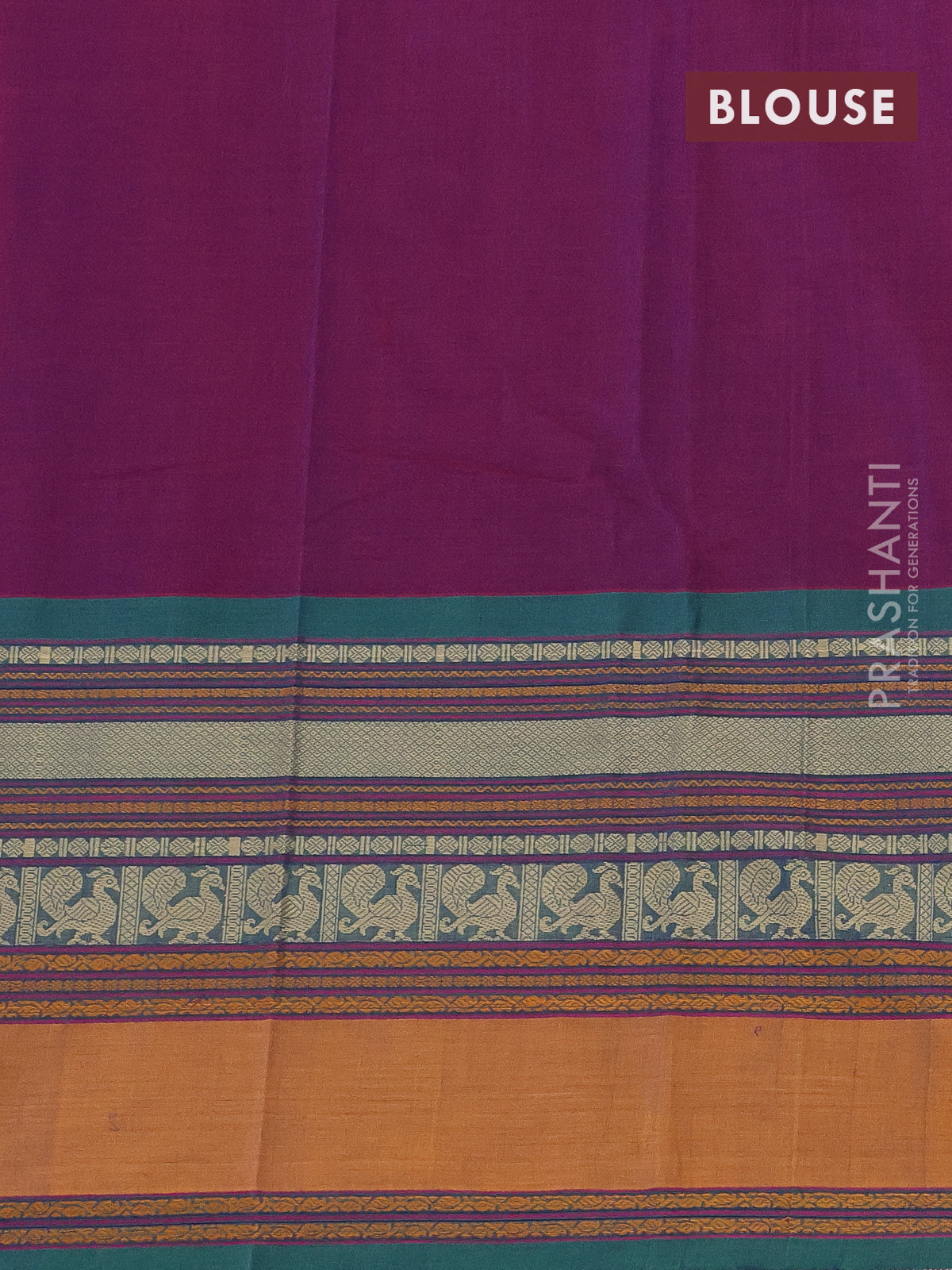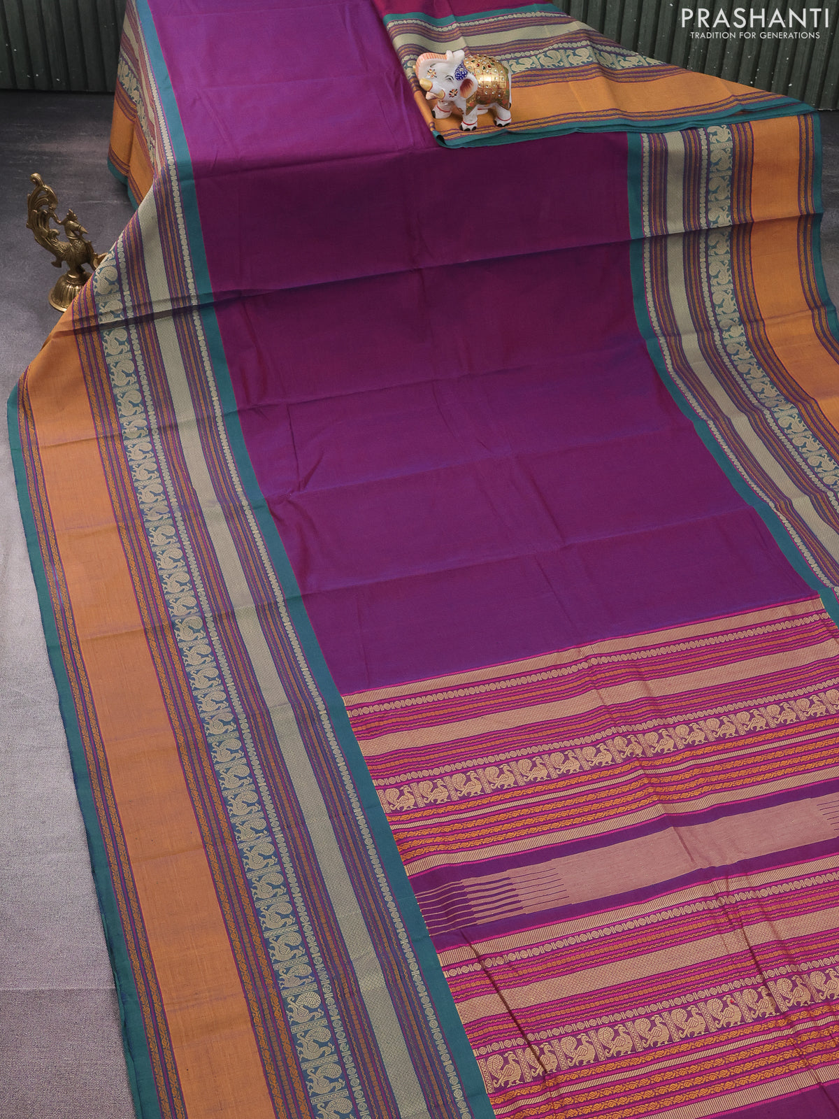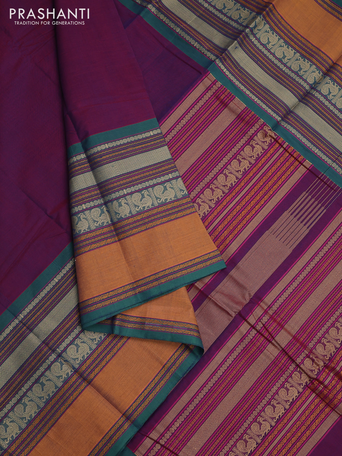 Kanchi cotton saree dual shade of purple and green with plain body and long thread woven border