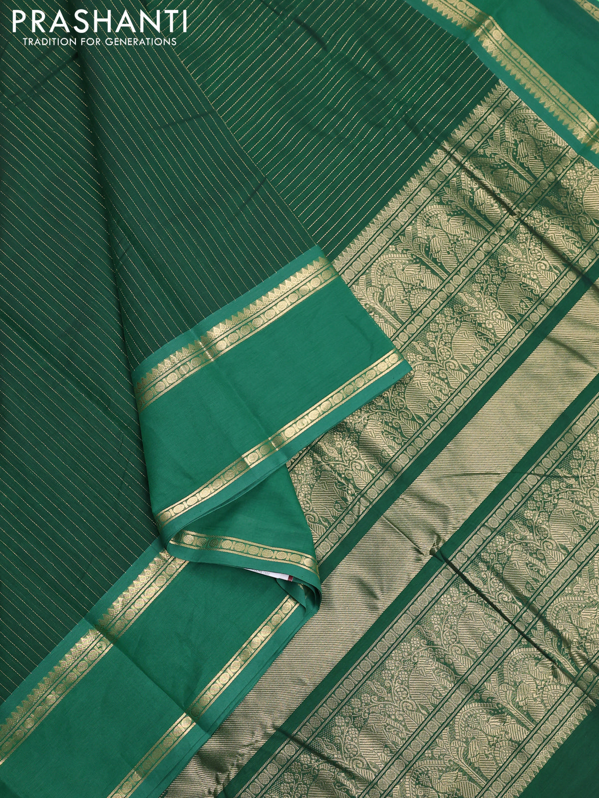 Kanchi cotton saree green with allover zari stripe pattern and rettapet zari woven border