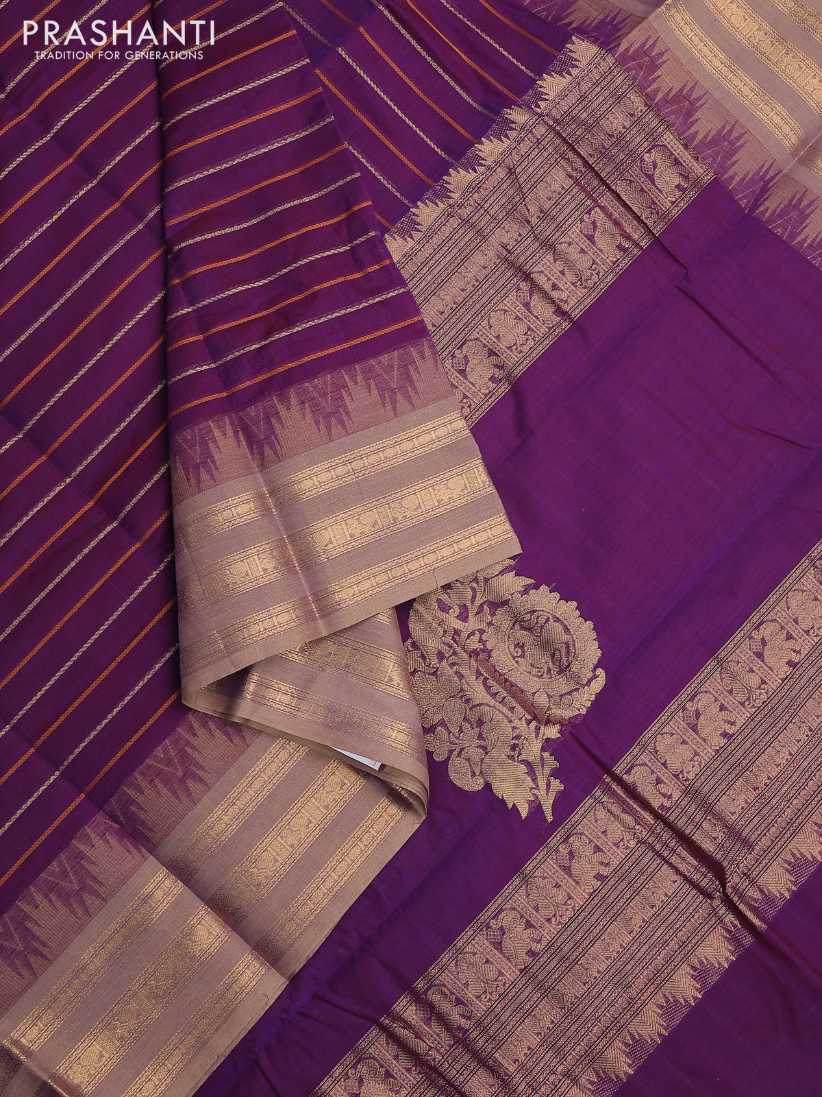 Kanchi cotton saree purple and beige with allover thread woven stripes pattern and temple design zari woven border