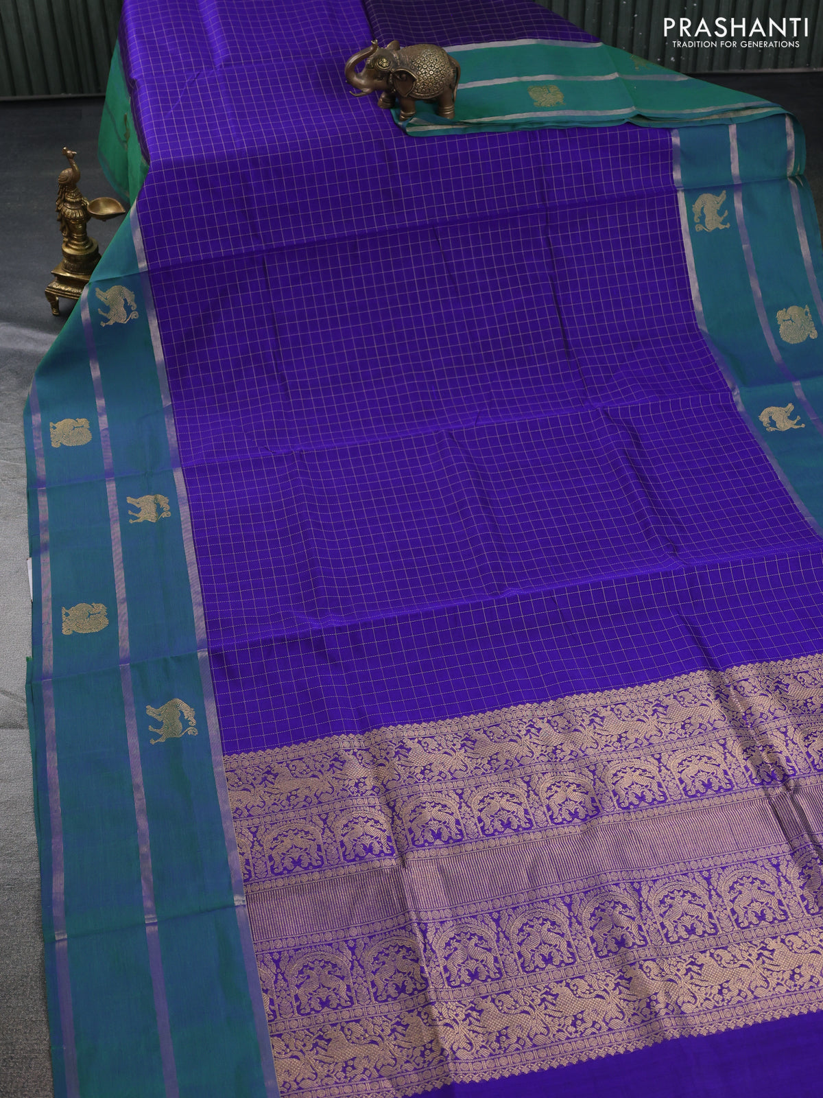 Kanchipuram silk cotton saree blue and green with allover thread checked pattern and rettapet zari woven butta border