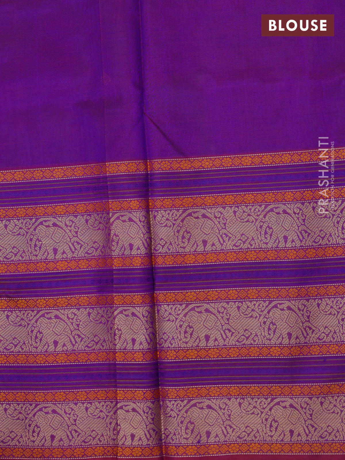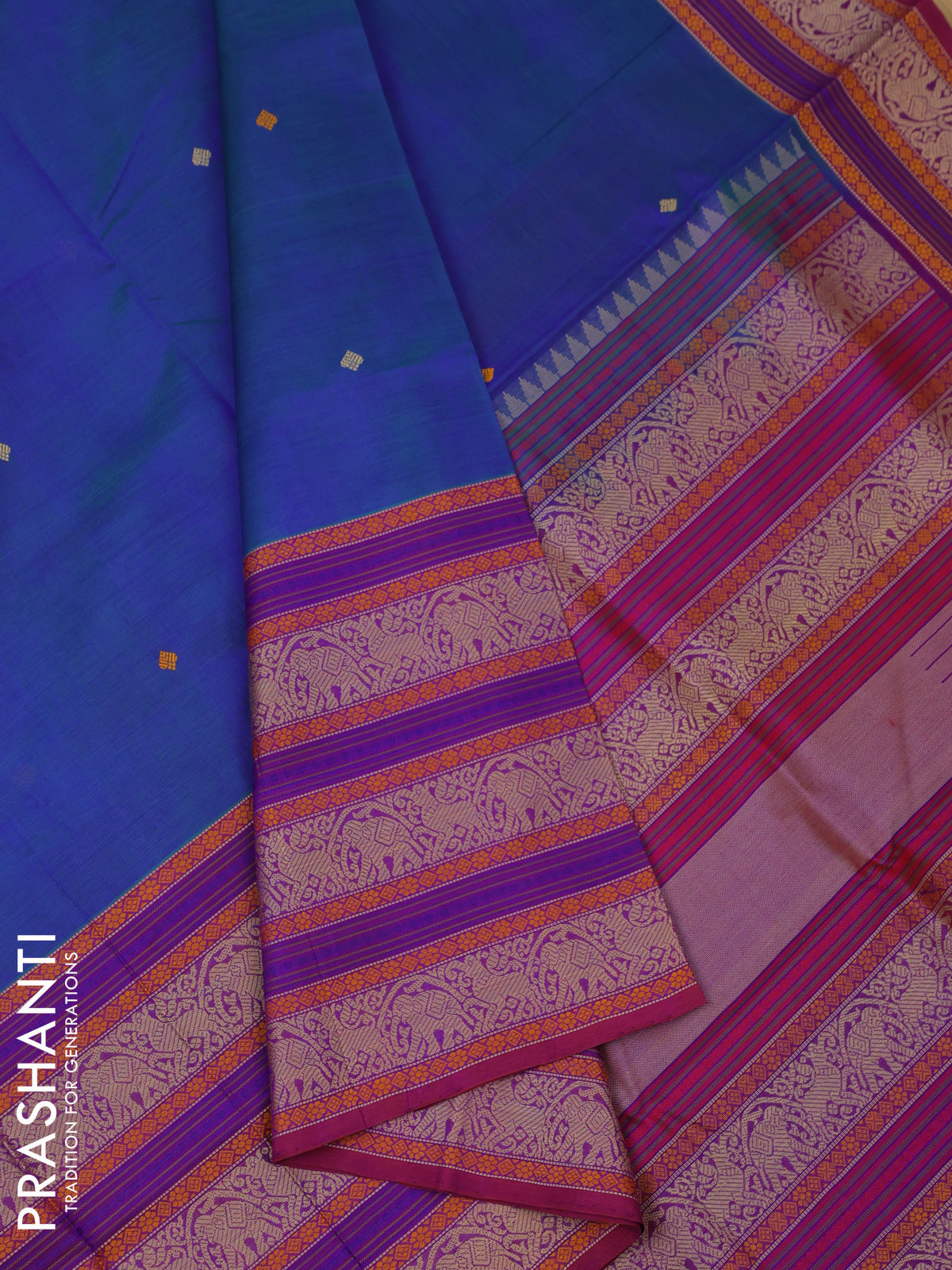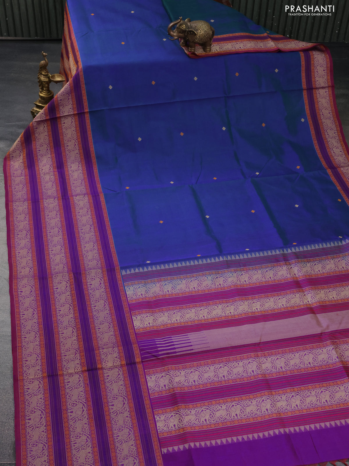 Kanchipuram silk cotton saree dual shade of bluish green and maroon with thread woven buttas and long thread woven border