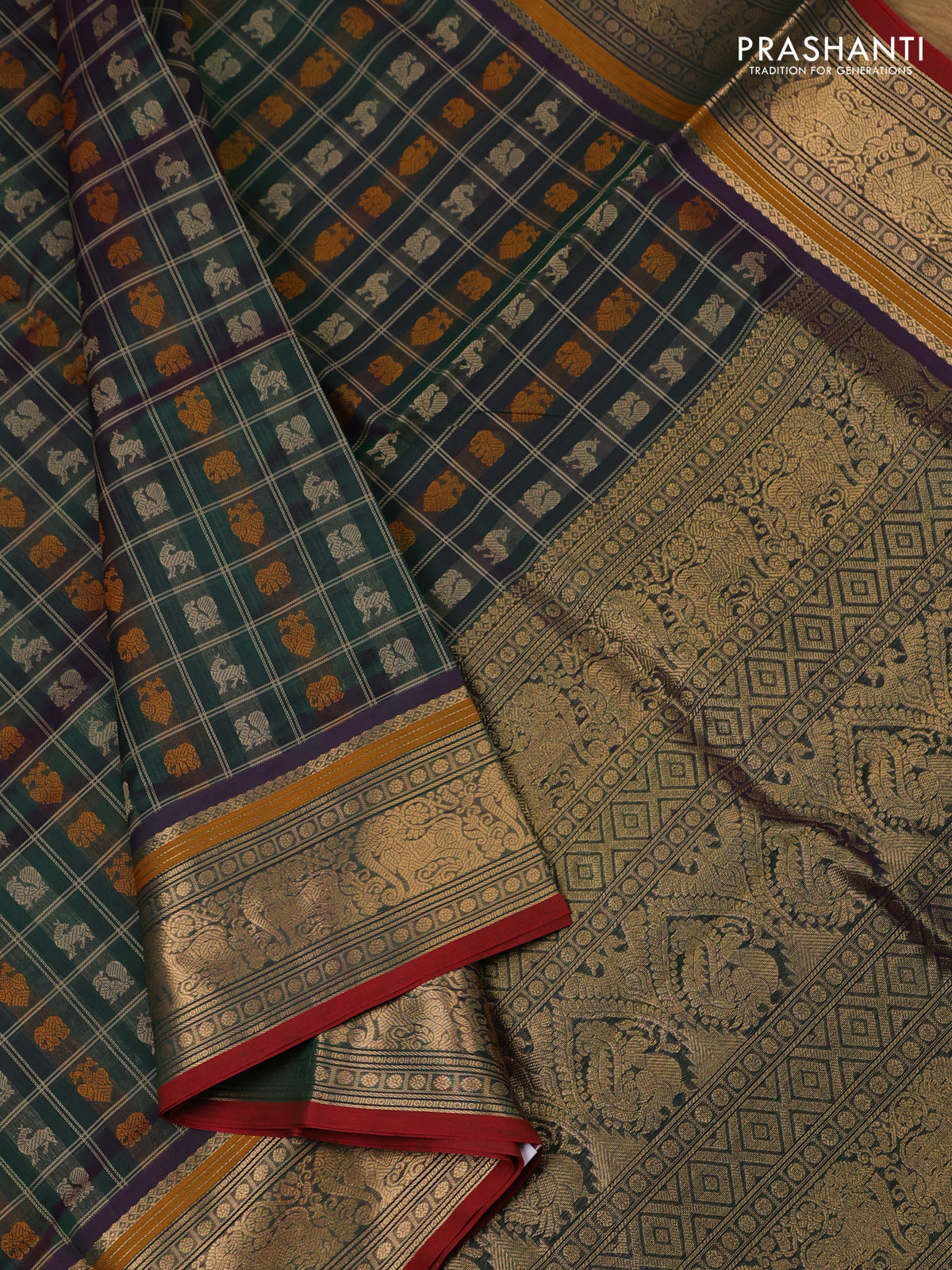 Kanchipuram silk cotton saree dual shade of green and maroon with allover thread checks & 1000 buttas and zari woven border