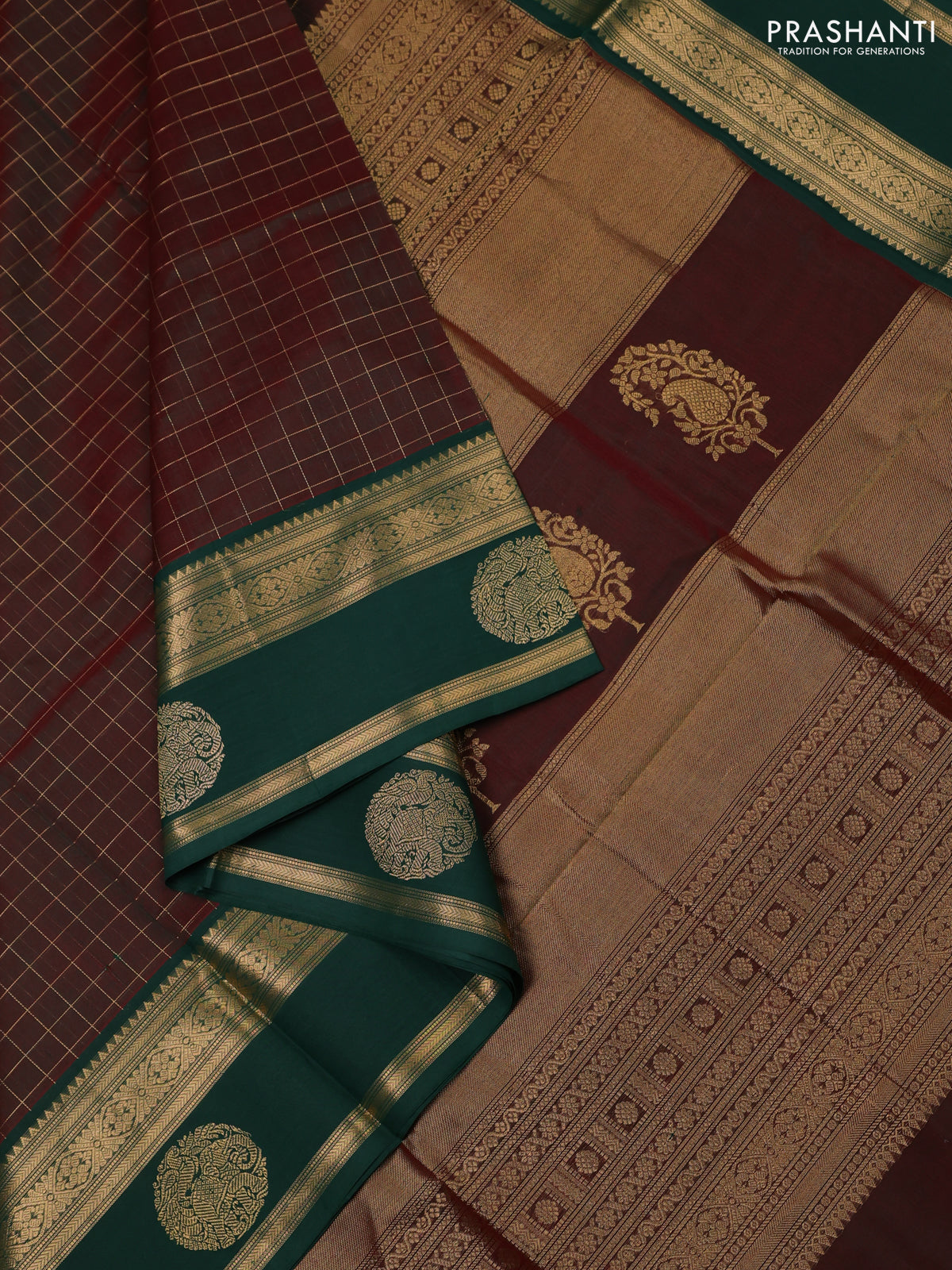 Kanchipuram silk cotton saree dual shade of maroon and green with allover zari checked pattern and zari woven butta border
