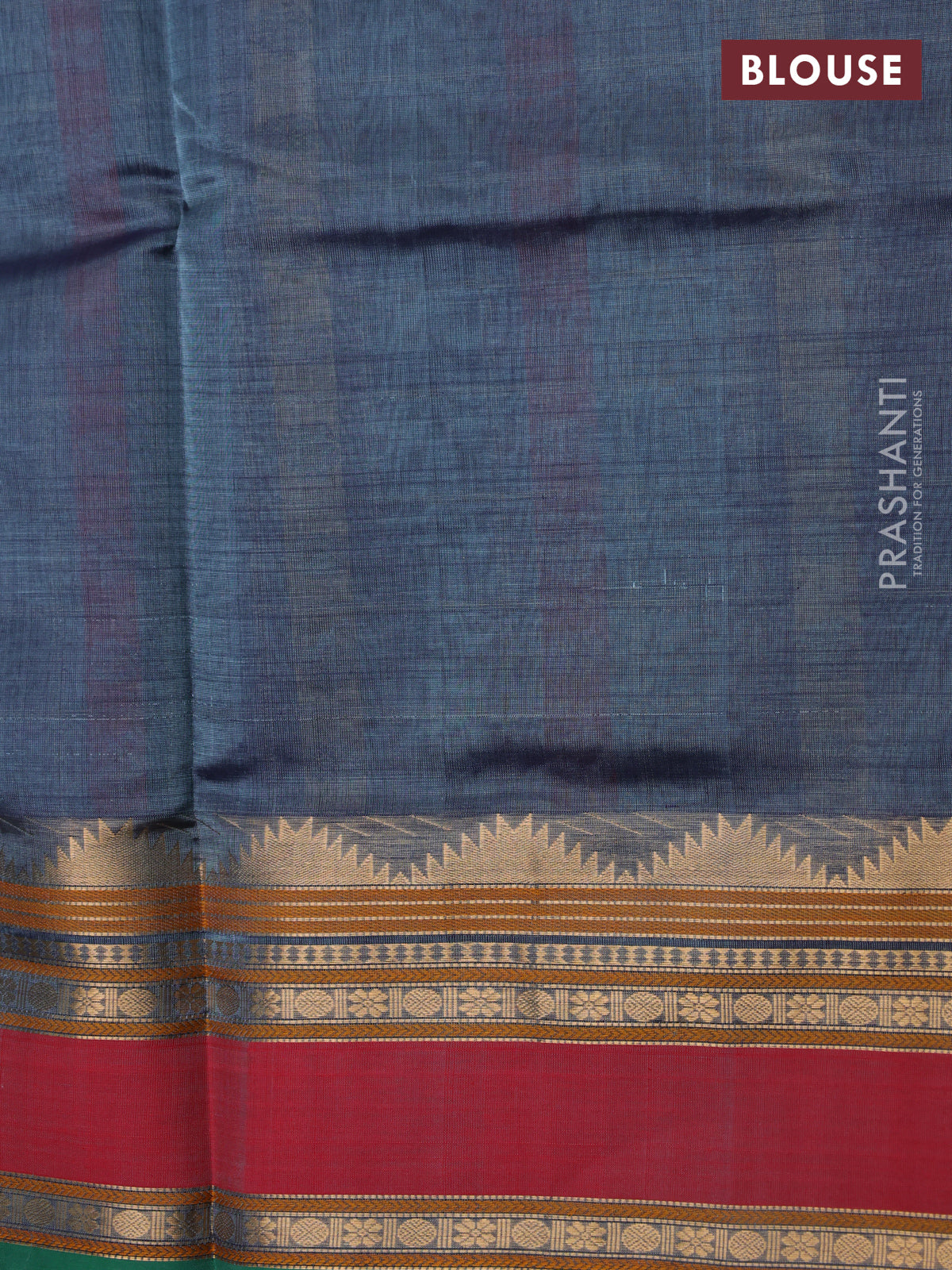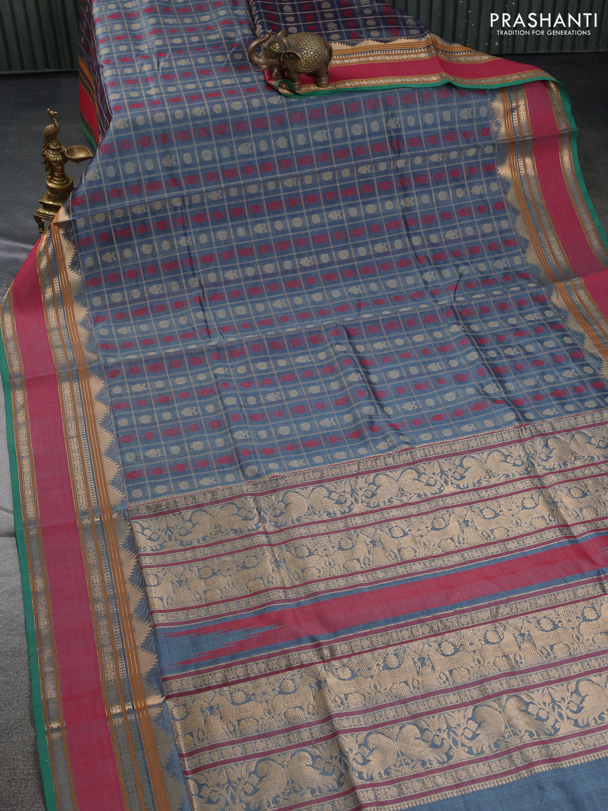 Kanchipuram silk cotton saree grey and green with allover thread checks & 1000 buttas and rettapet zari woven border