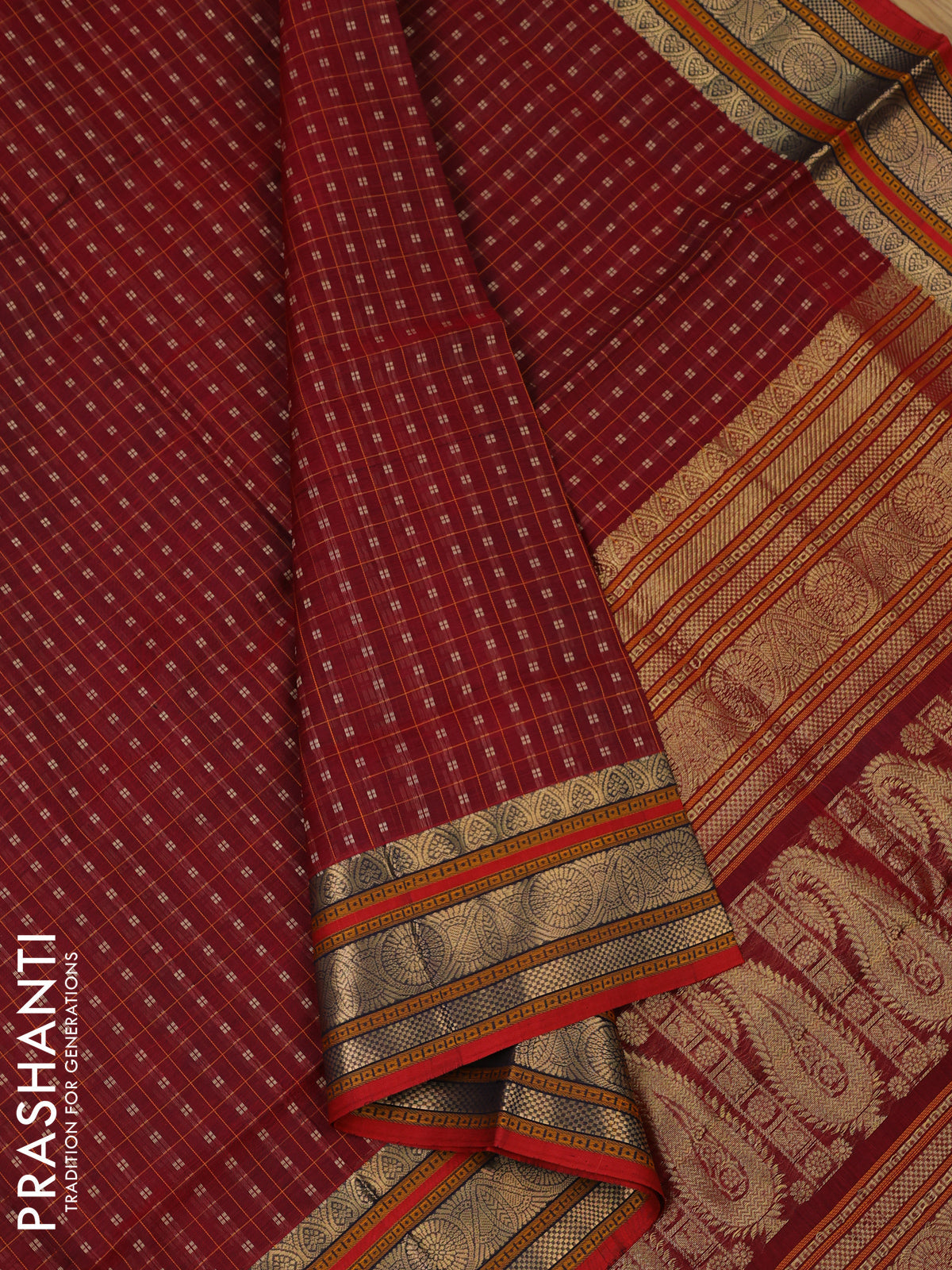 Kanchipuram silk cotton saree maroon and red with allover thread checks & buttas and zari woven border