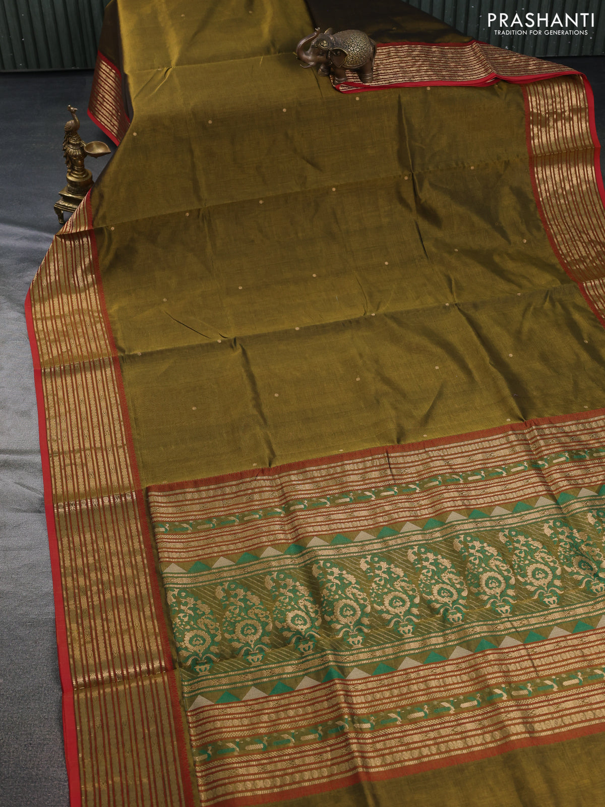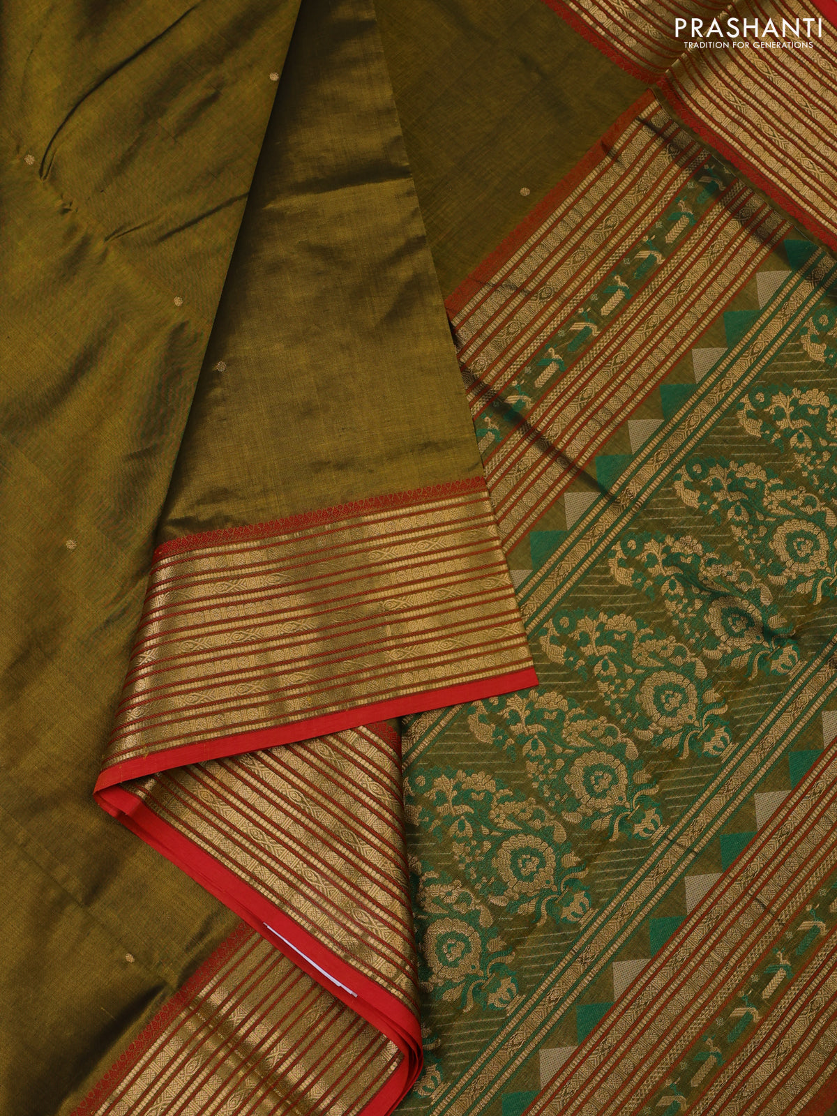 Kanchipuram silk cotton saree mehendi green and maroon with zari woven buttas and zari woven border