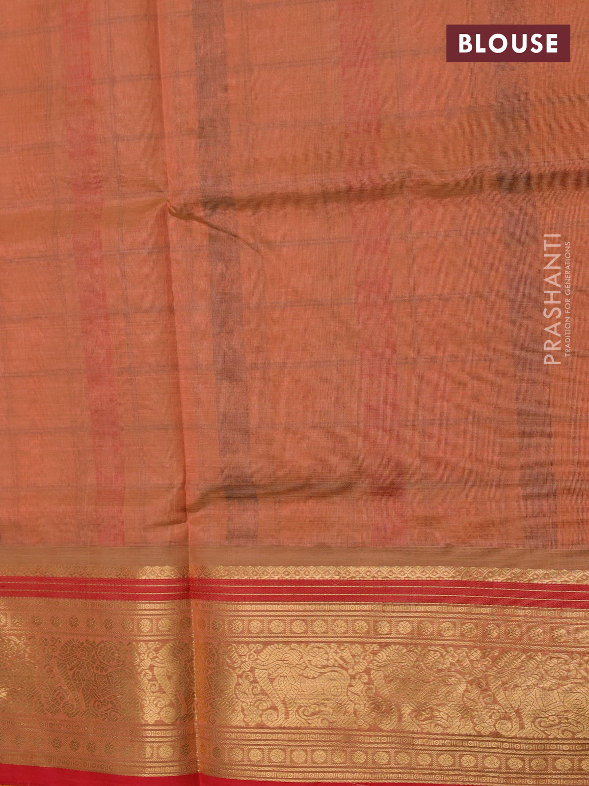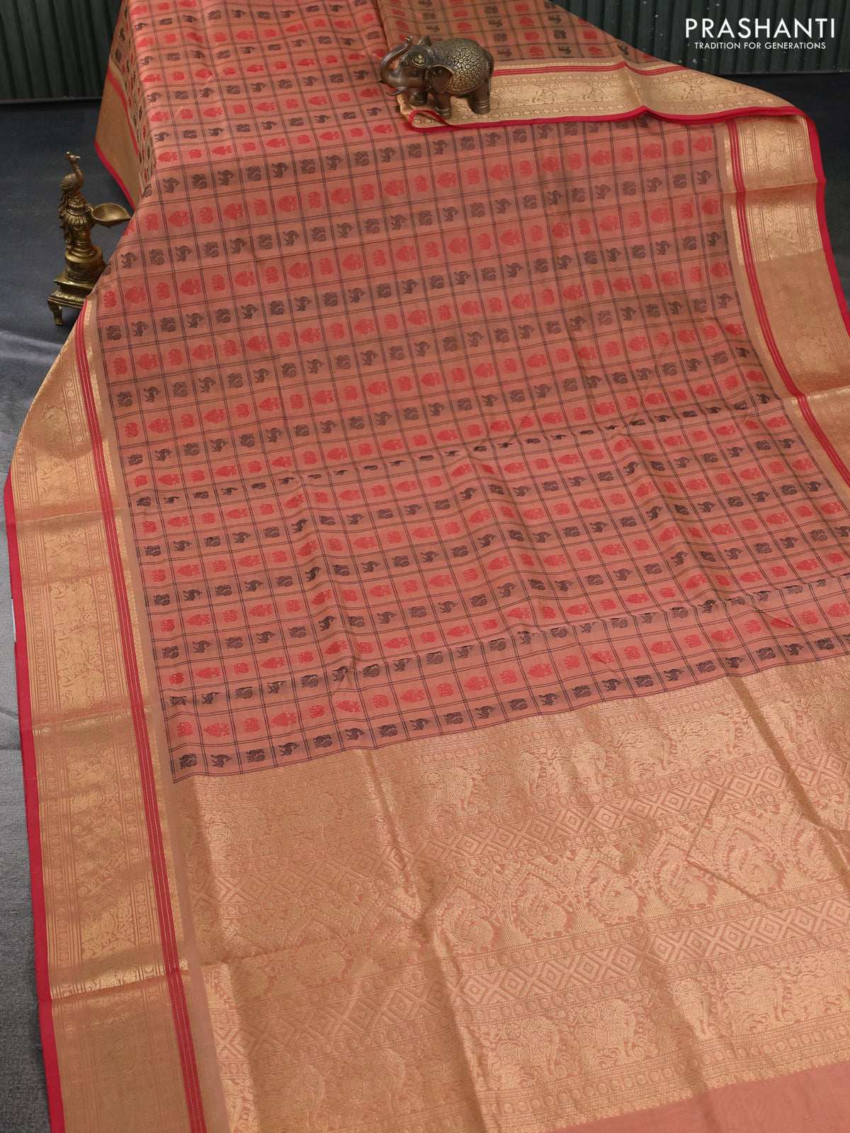 Kanchipuram silk cotton saree peach shade and red with allover thread checks & 1000 buttas and zari woven border