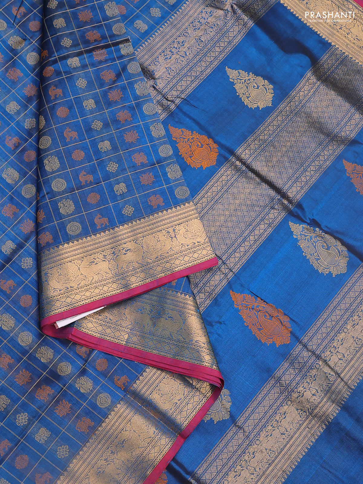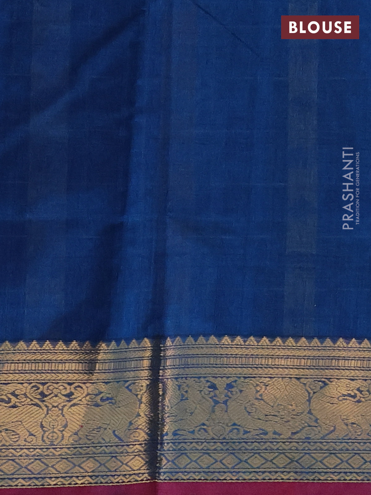 Kanchipuram silk cotton saree peacock blue and maroon with allover thread woven checks & buttas and annam zari woven border