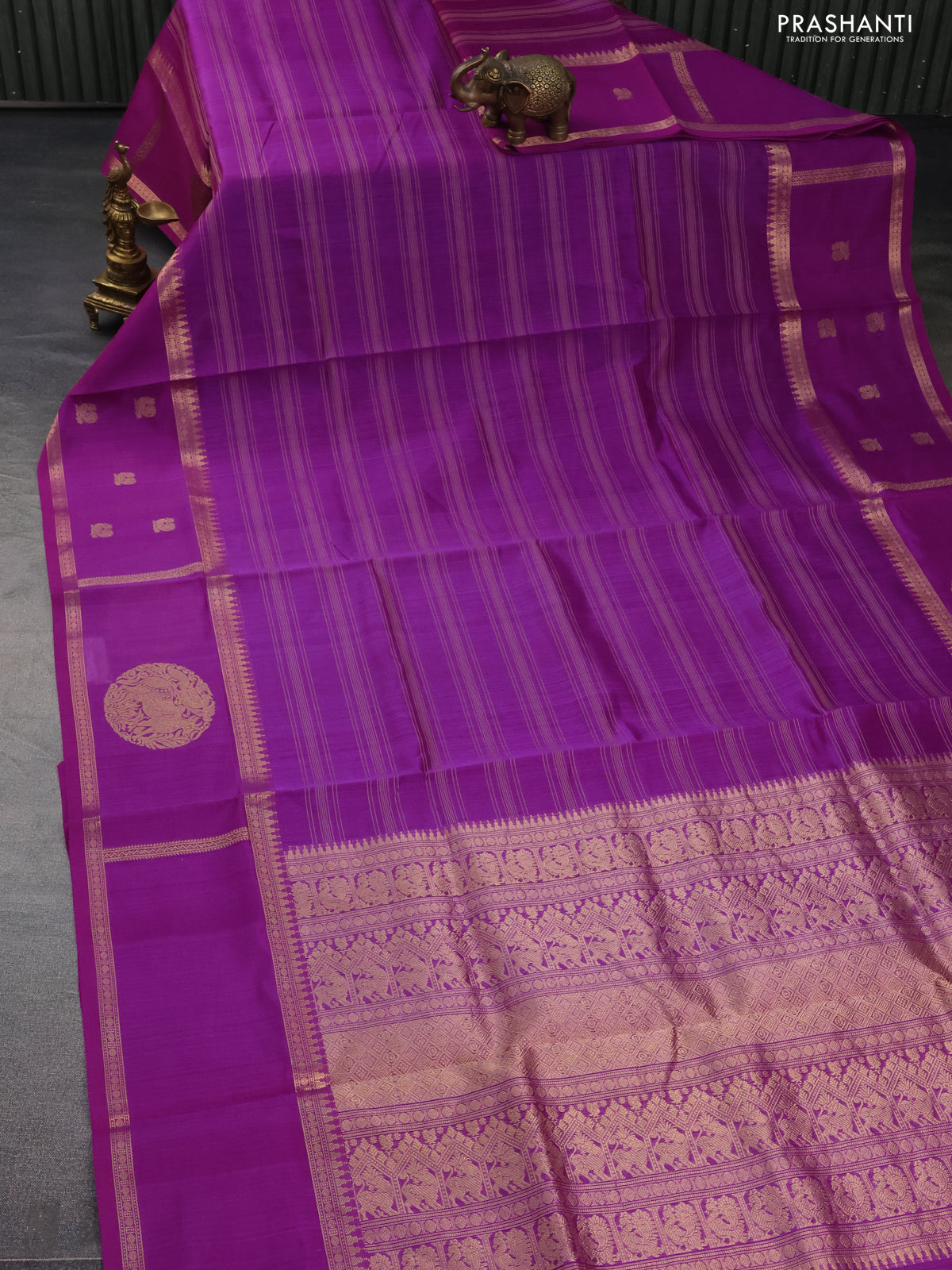 Kanchipuram silk cotton saree purple with allover thread woven stripes pattern and rettapet zari woven butta border