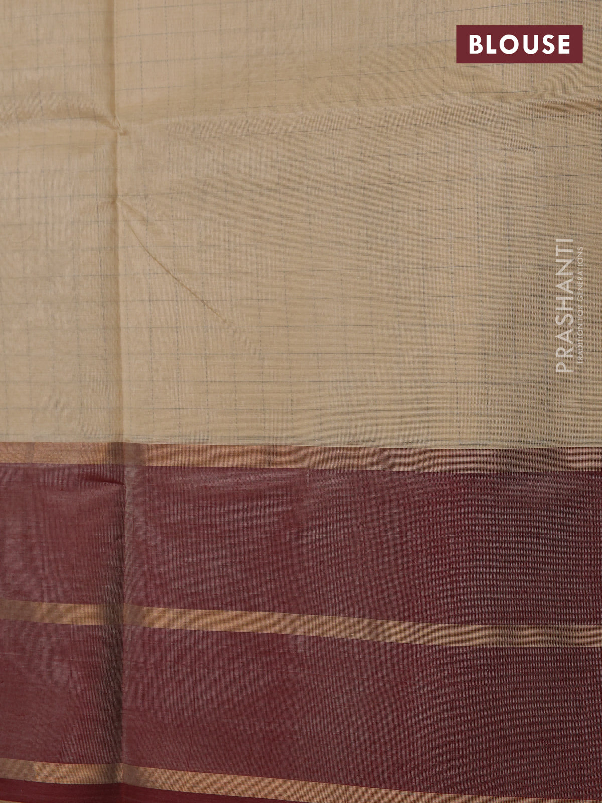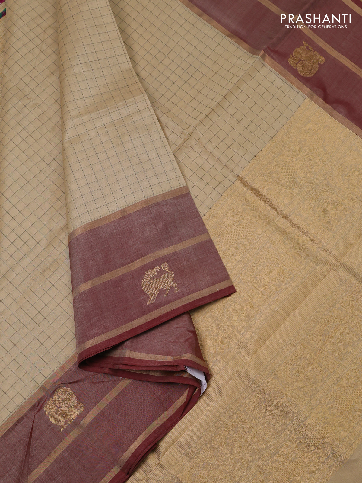 Kanchipuram silk cotton saree sandal and maroon with allover thread checked pattern and rettapet zari woven butta border