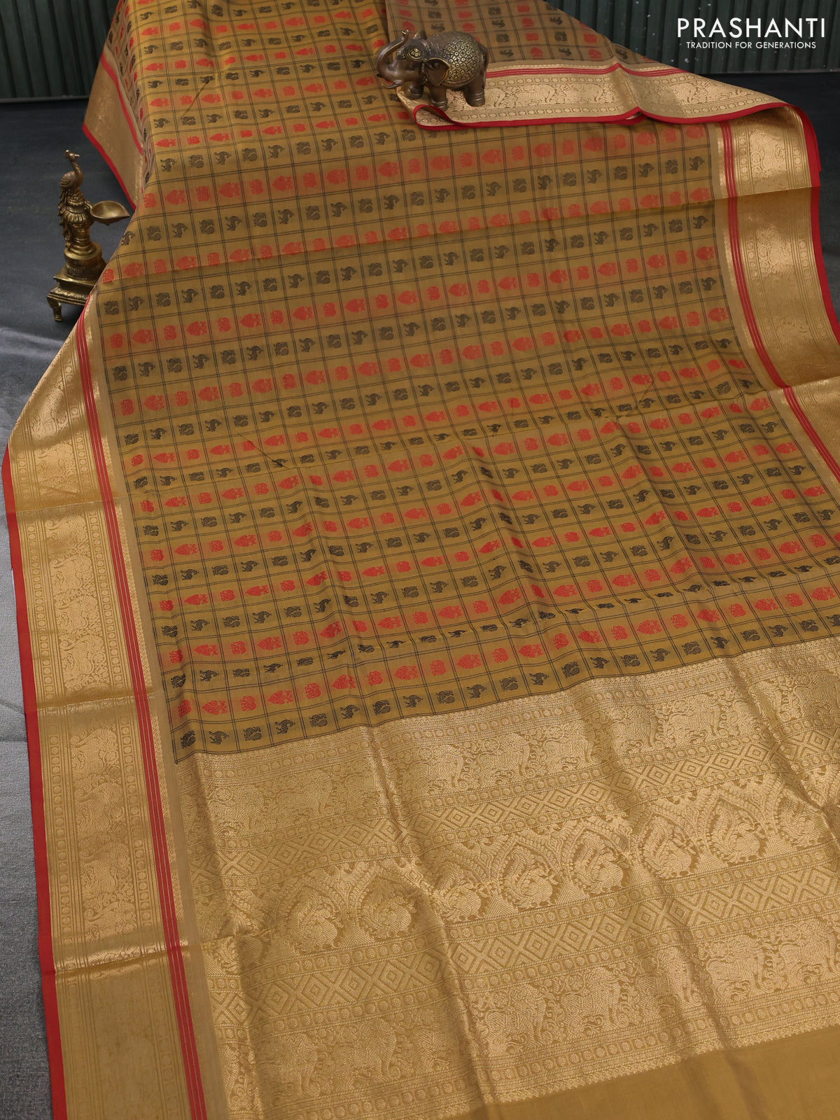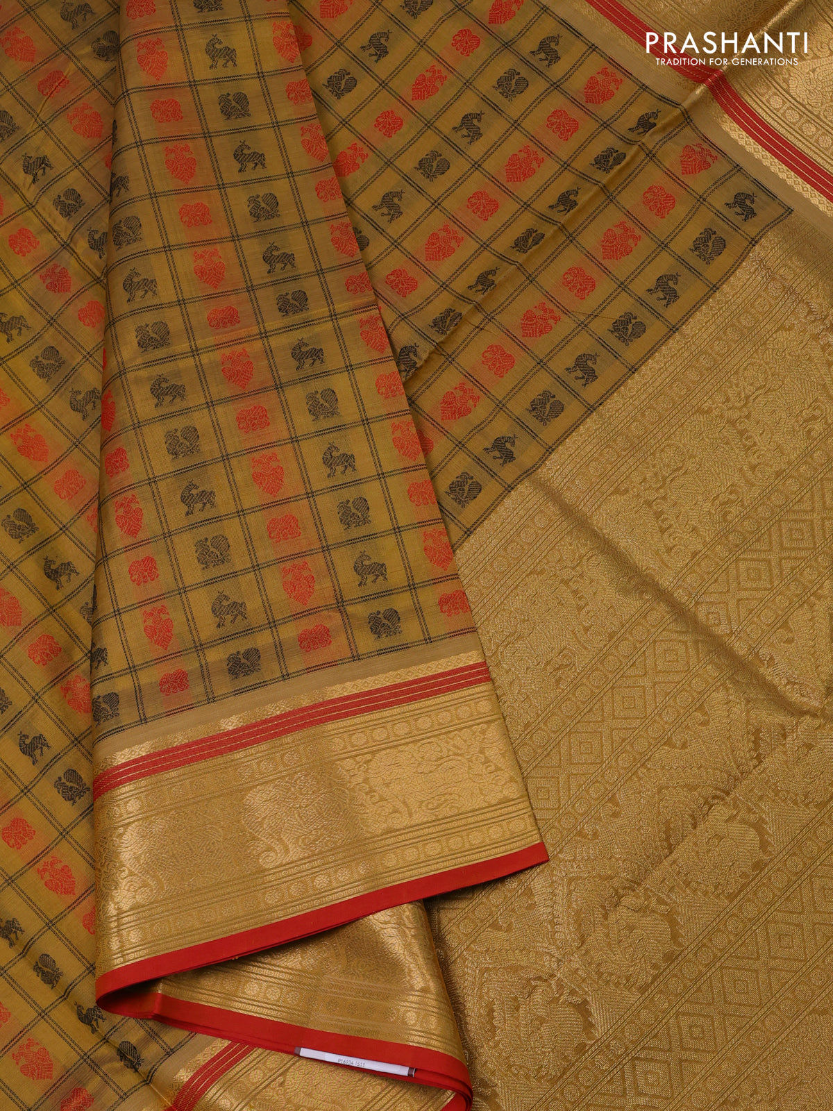 Kanchipuram silk cotton saree sandal and red with allover thread checks & 1000 buttas and zari woven border