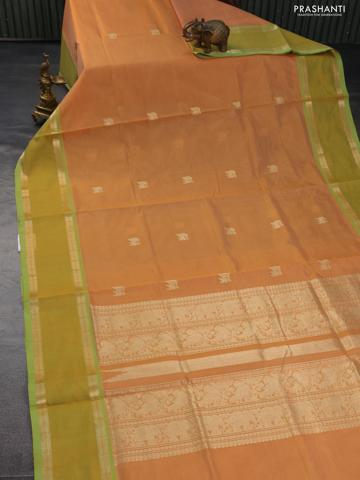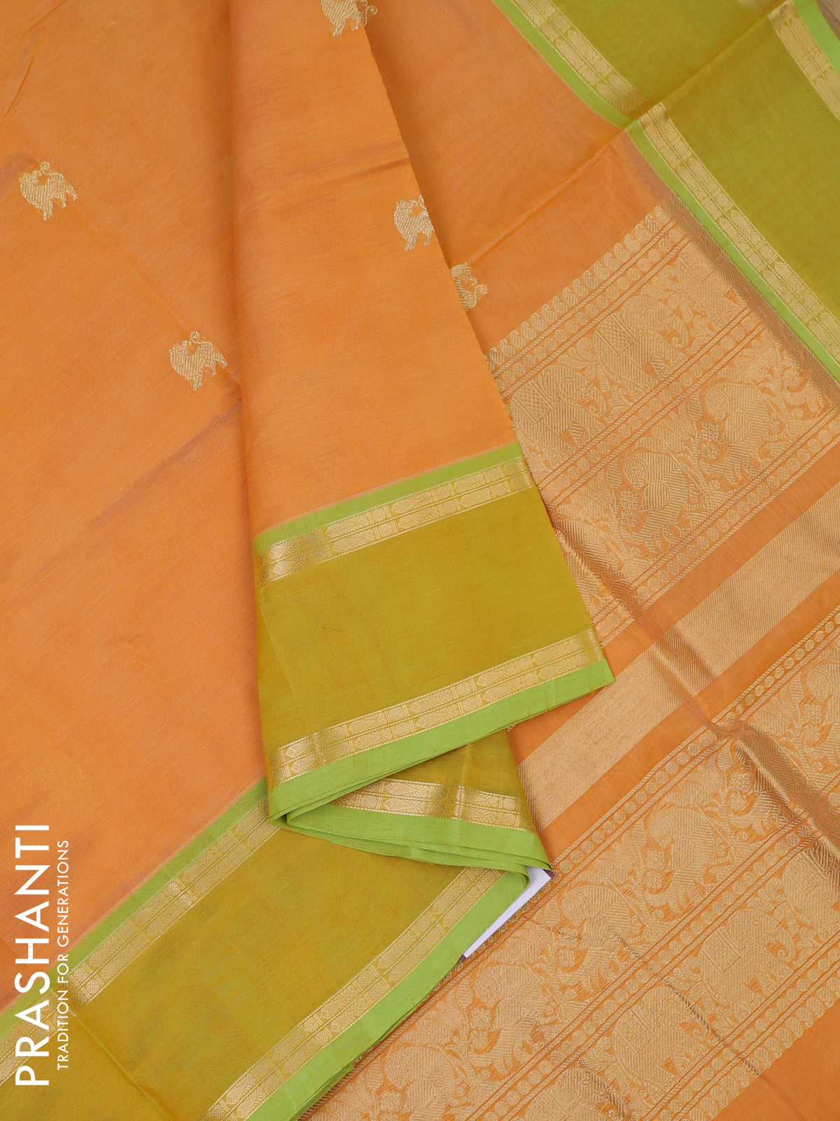 Kanchipuram silk cotton saree yellow and light green with zari woven buttas and rettapet zari woven border