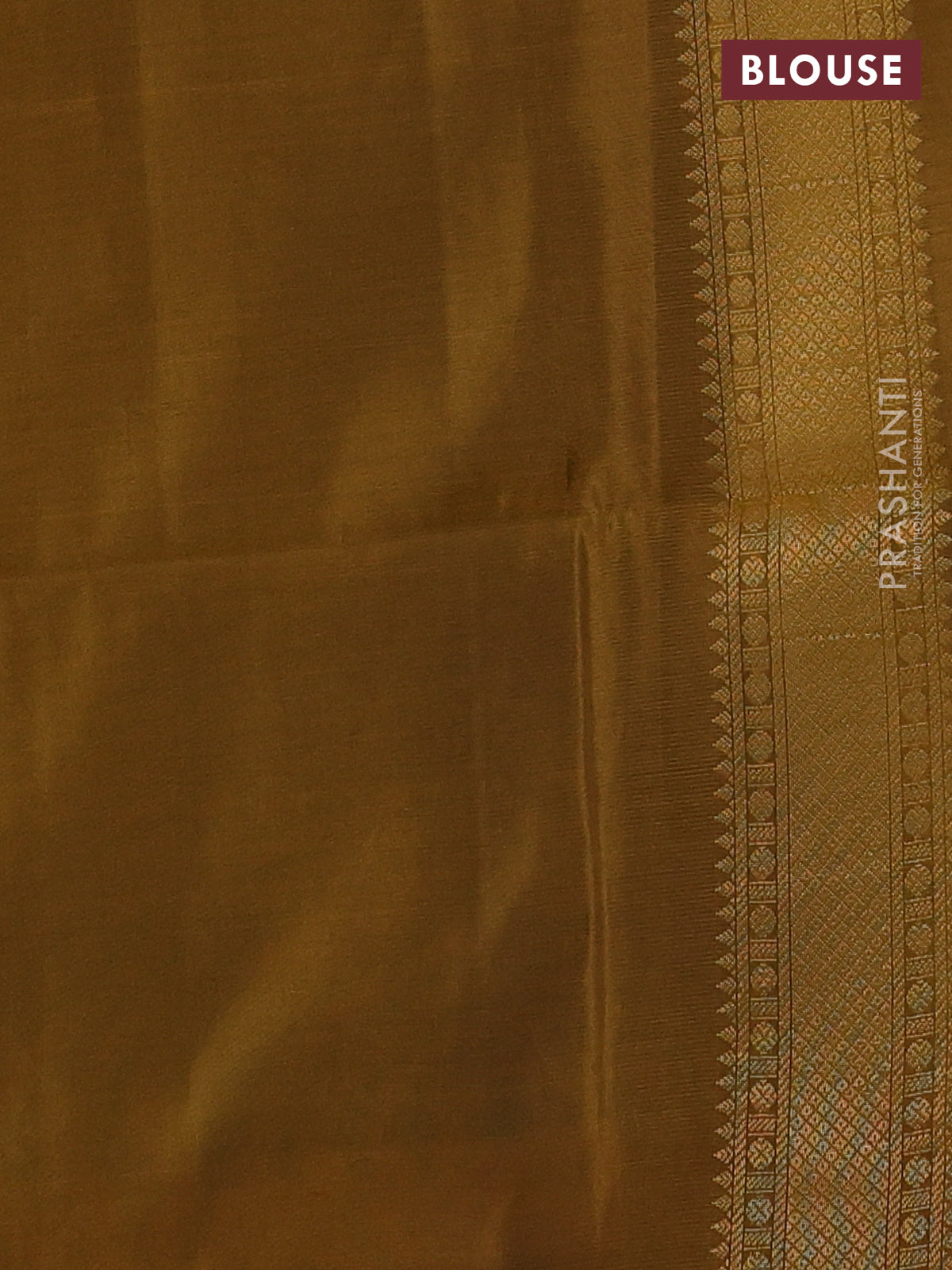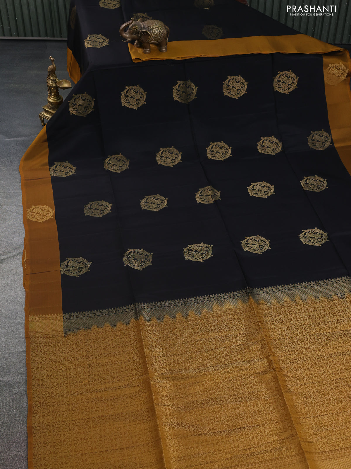 Kanchipuram soft silk saree black and dark mustard with zari woven buttas and zari woven butta border