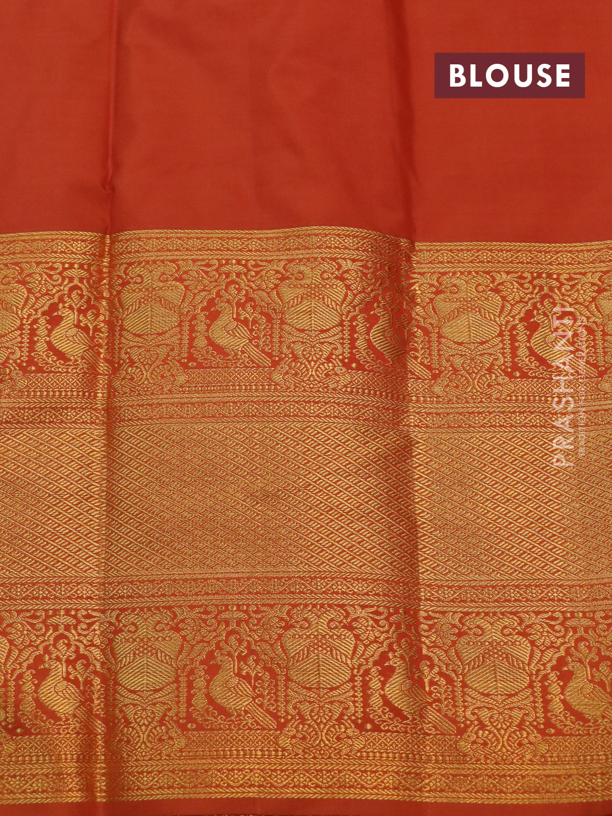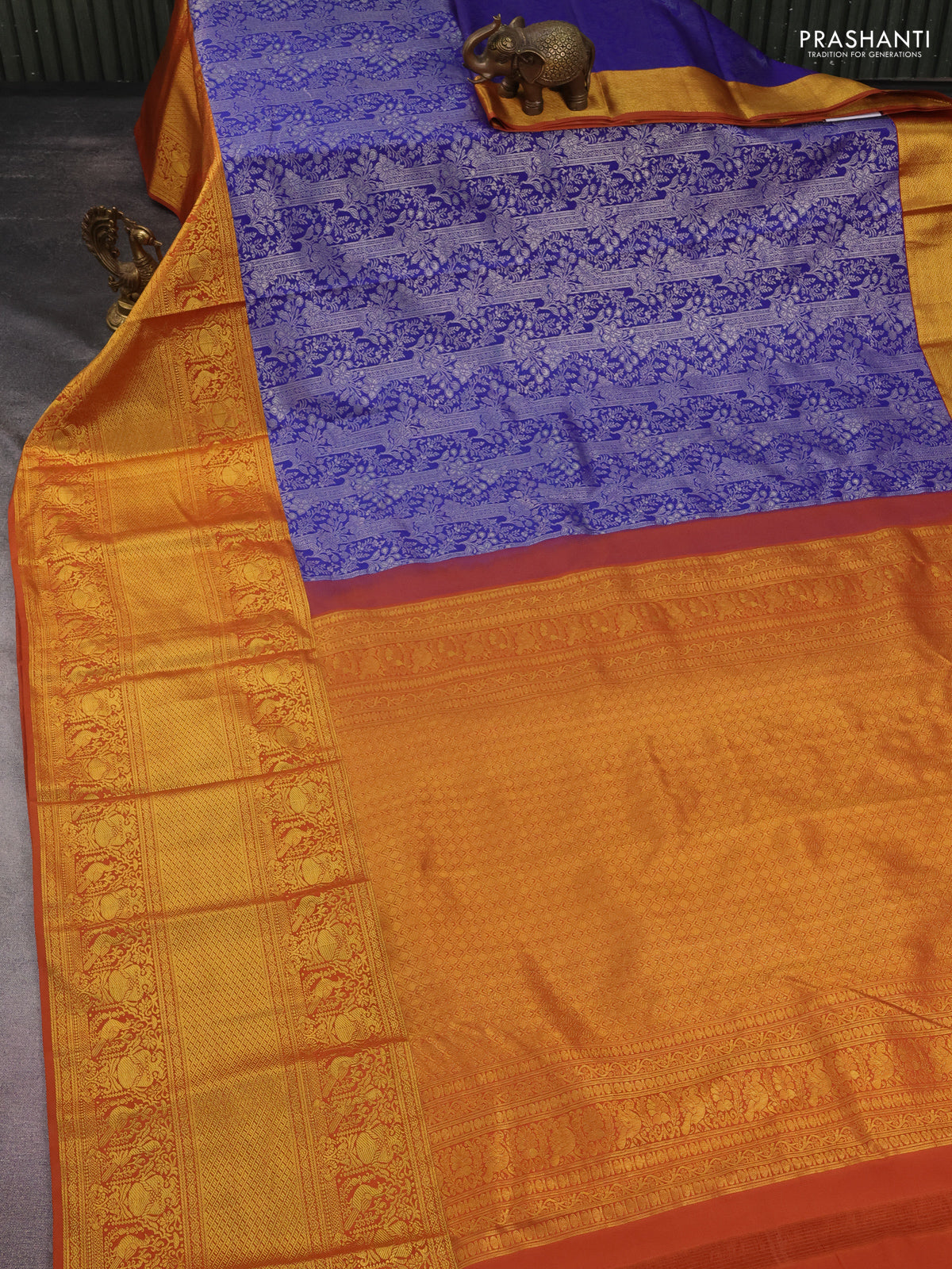 Kanchipuram silk saree blue and rustic orange with allover silver zari woven brocade weaves and long rich zari woven border