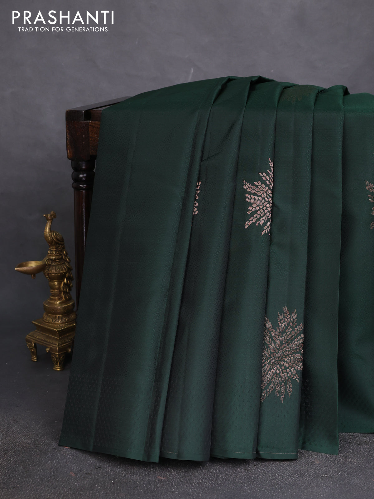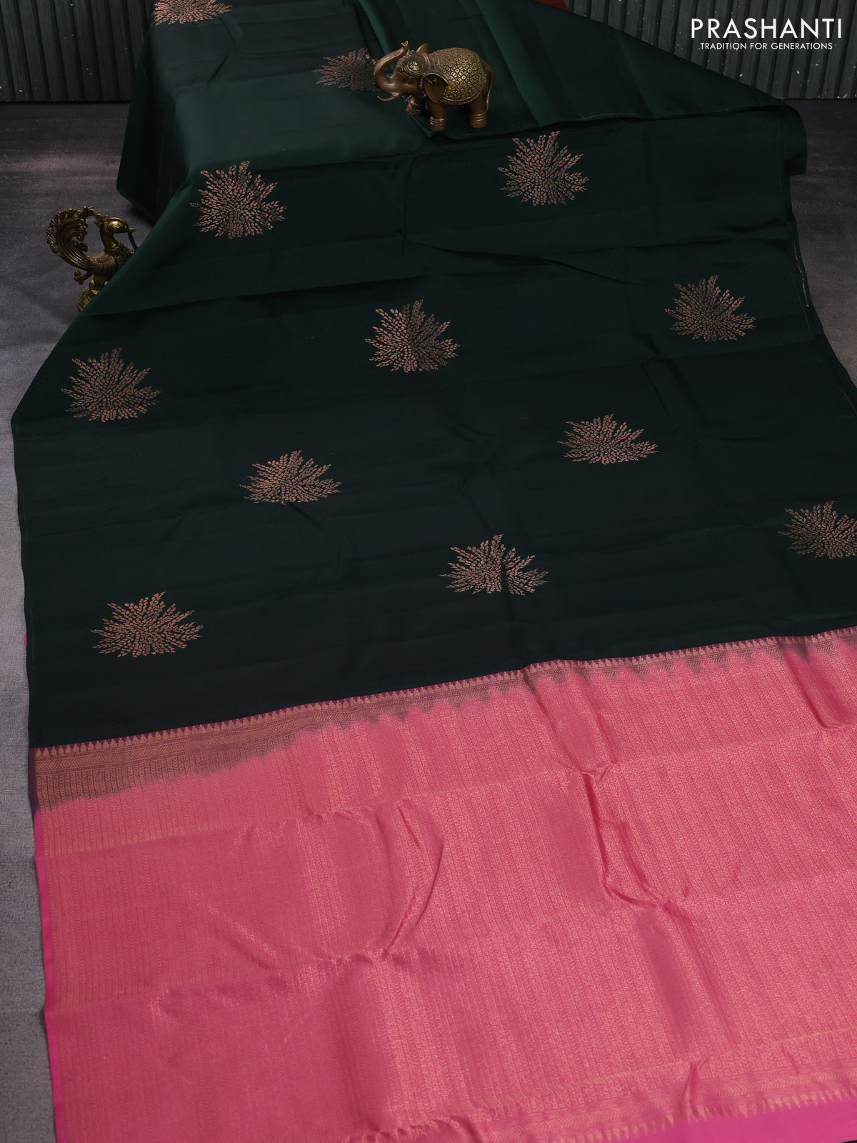 Kanchipuram silk saree bottle green and light pink with allover self emboss & zari buttas in borderless style