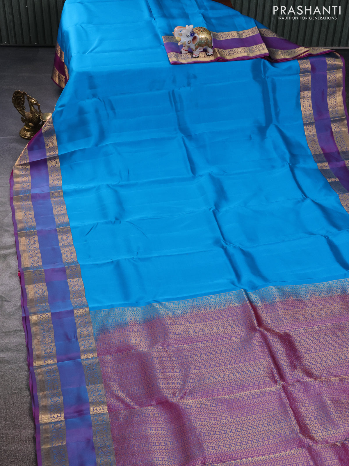 Kanchipuram silk saree cs blue and dual shade of purple with palin body and rettapet zari woven border