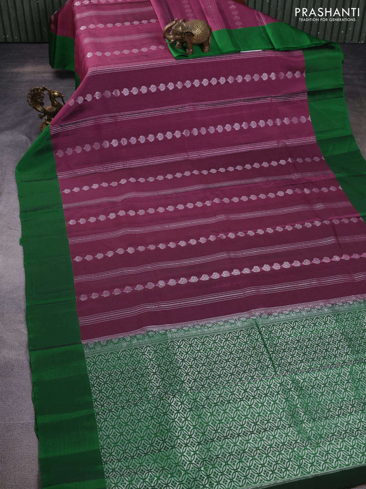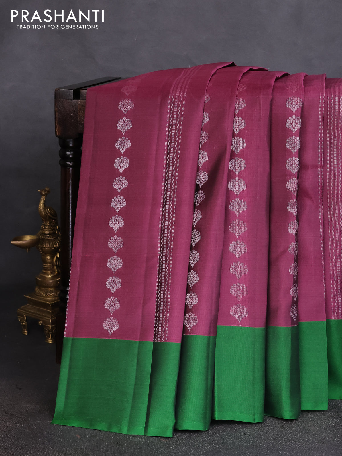 Kanchipuram silk saree dark magenta pink and green with allover silver zari weaves & buttas and simple border