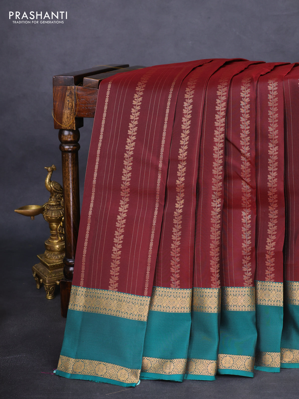 Kanchipuram silk saree deep maroon and teal green with allover zari weaves and rettapet zari woven border