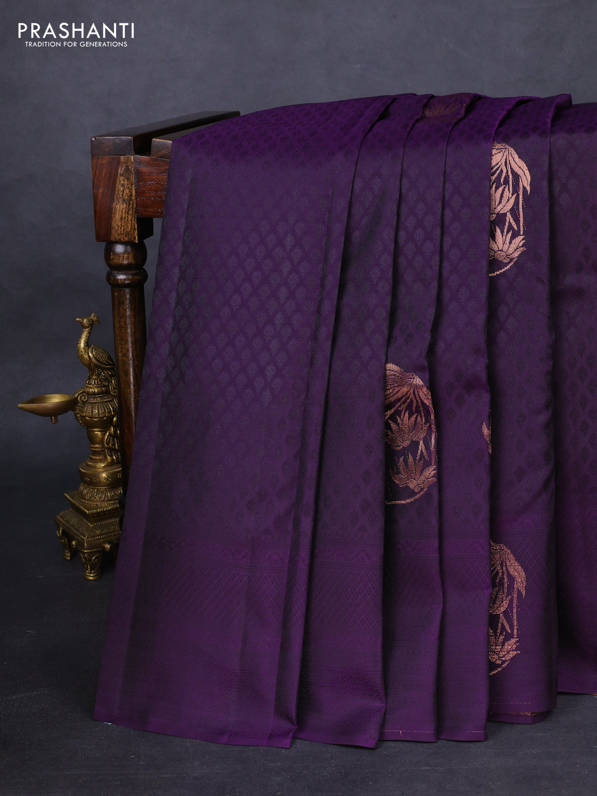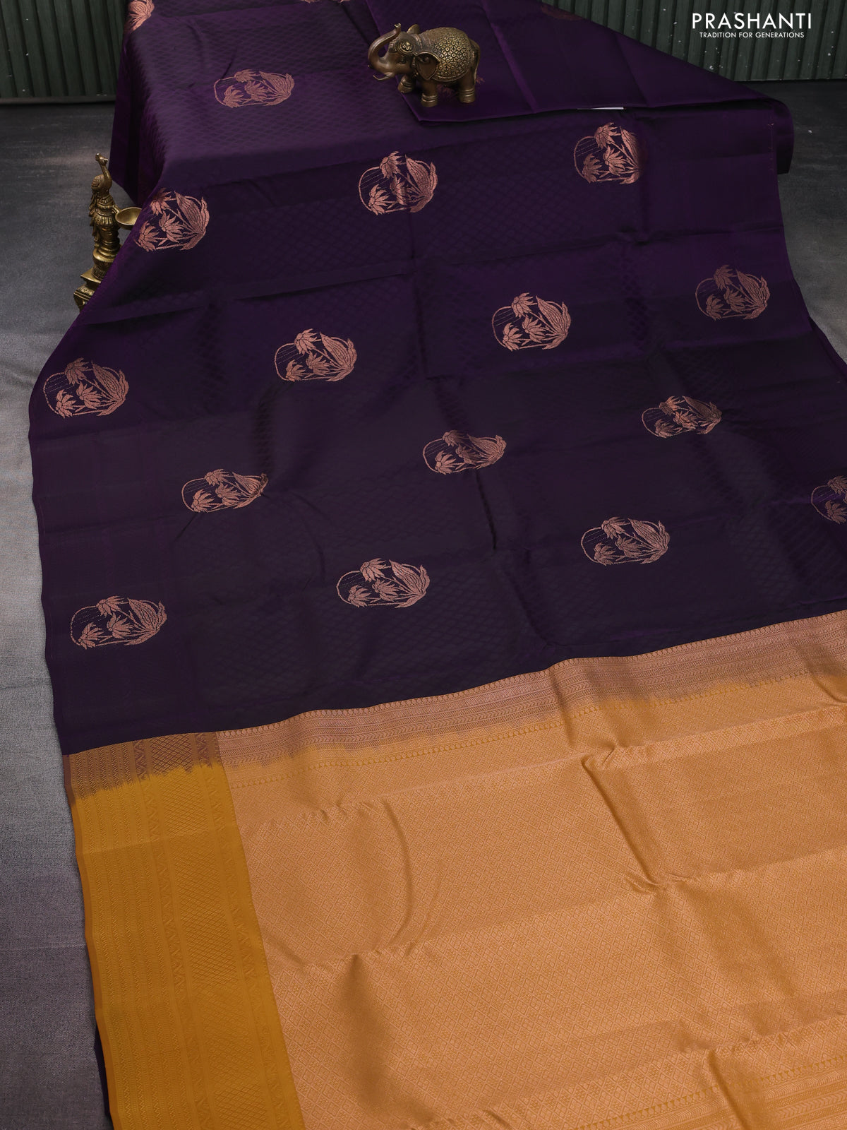 Kanchipuram silk saree deep violet and mustard yellow with allover self emboss and zari butta border