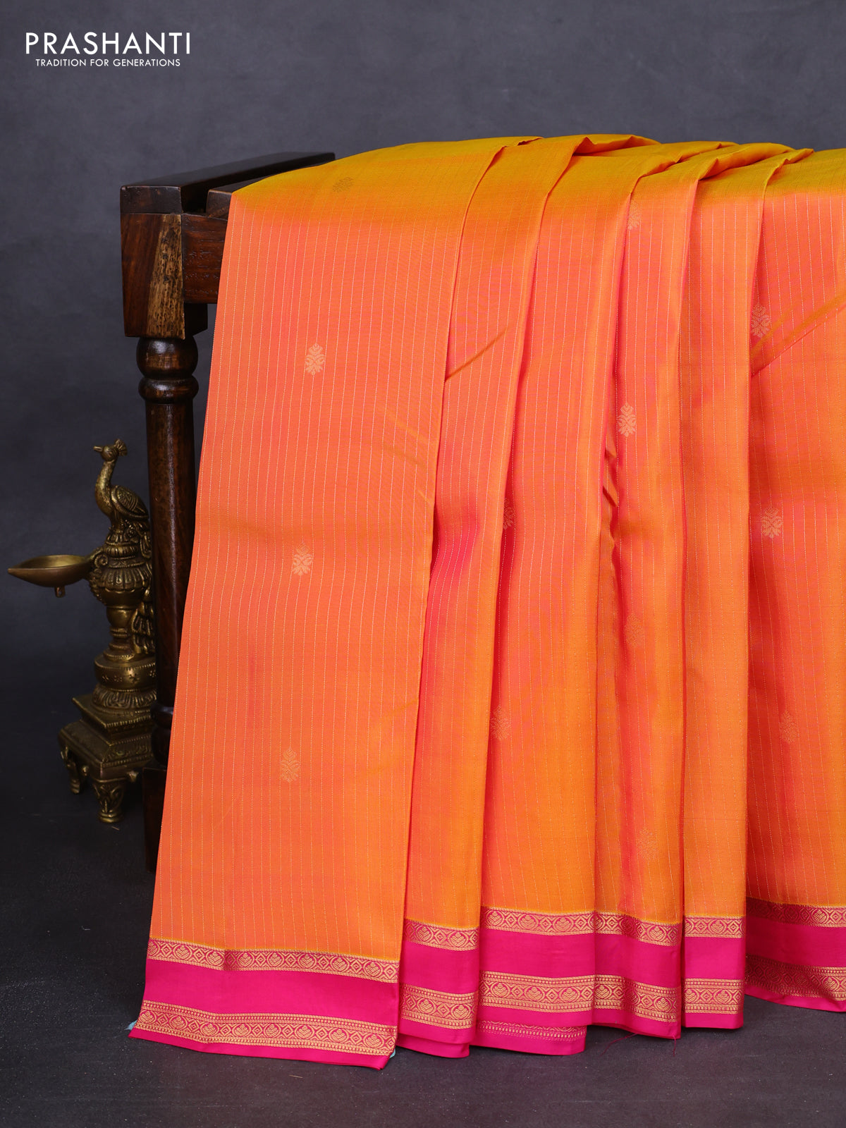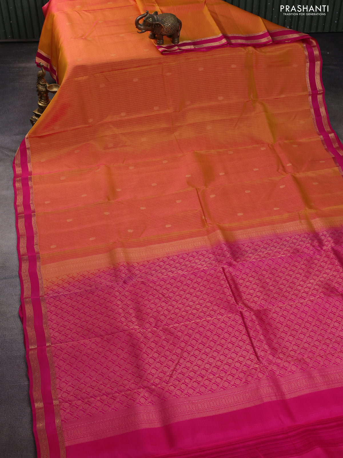Kanchipuram silk saree dual shade of mustard and pink with allover zari weaves and zari woven border