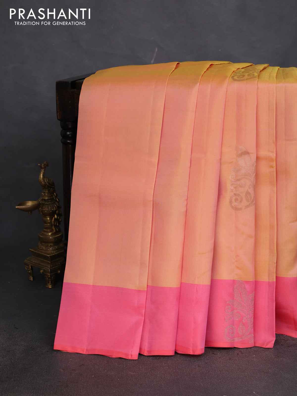 Kanchipuram silk saree dual shade of yellow and peach pink with copper zari woven buttas and copper zari woven butta border