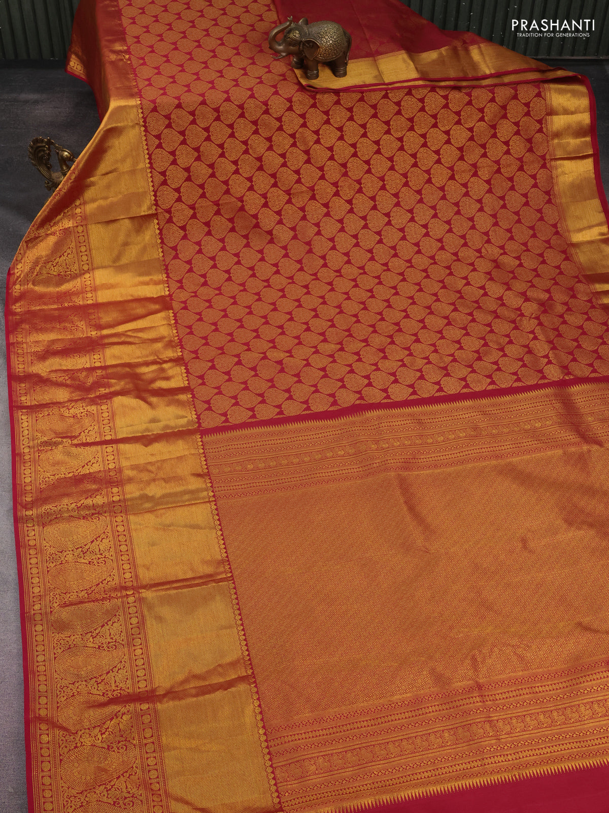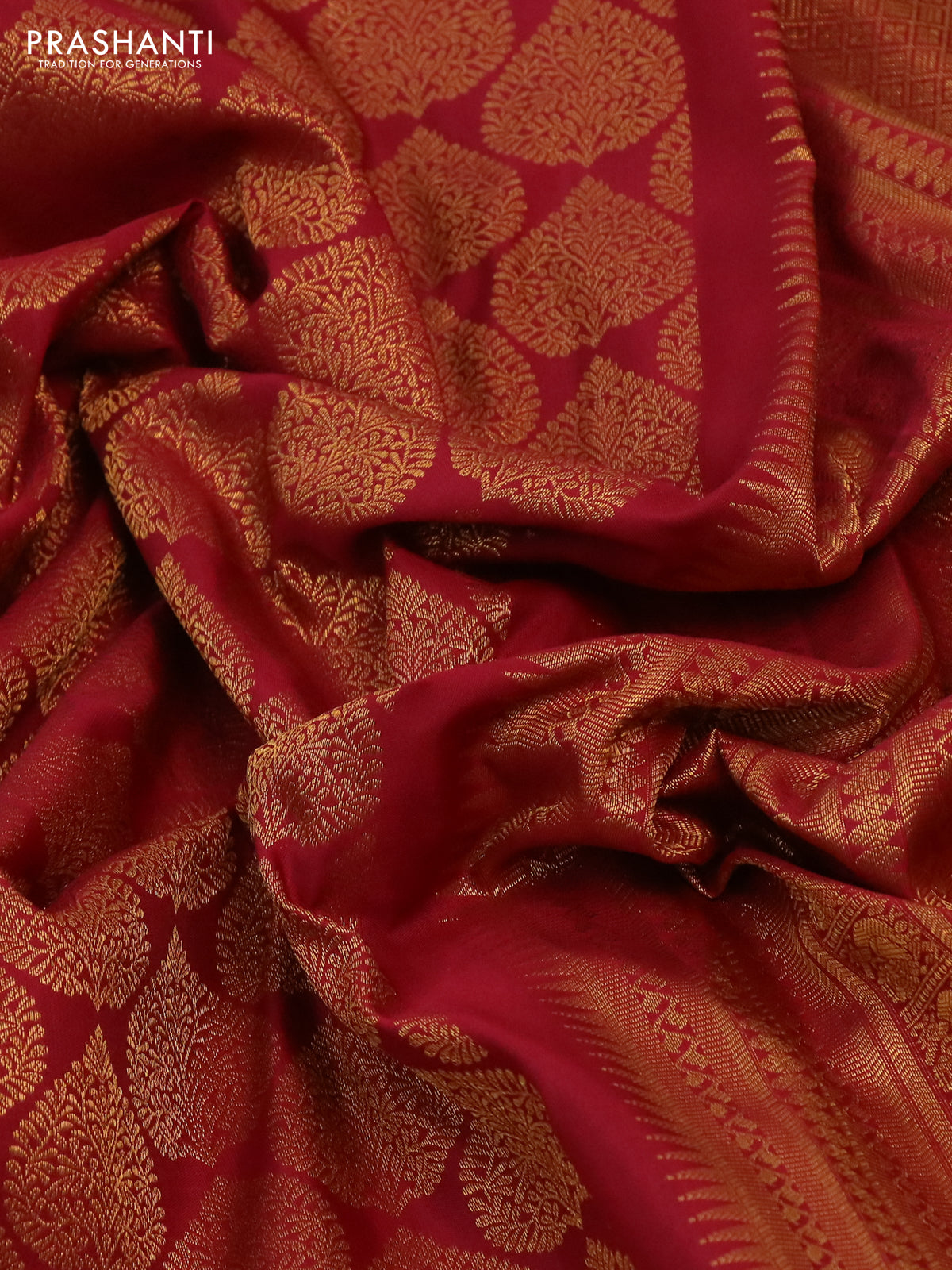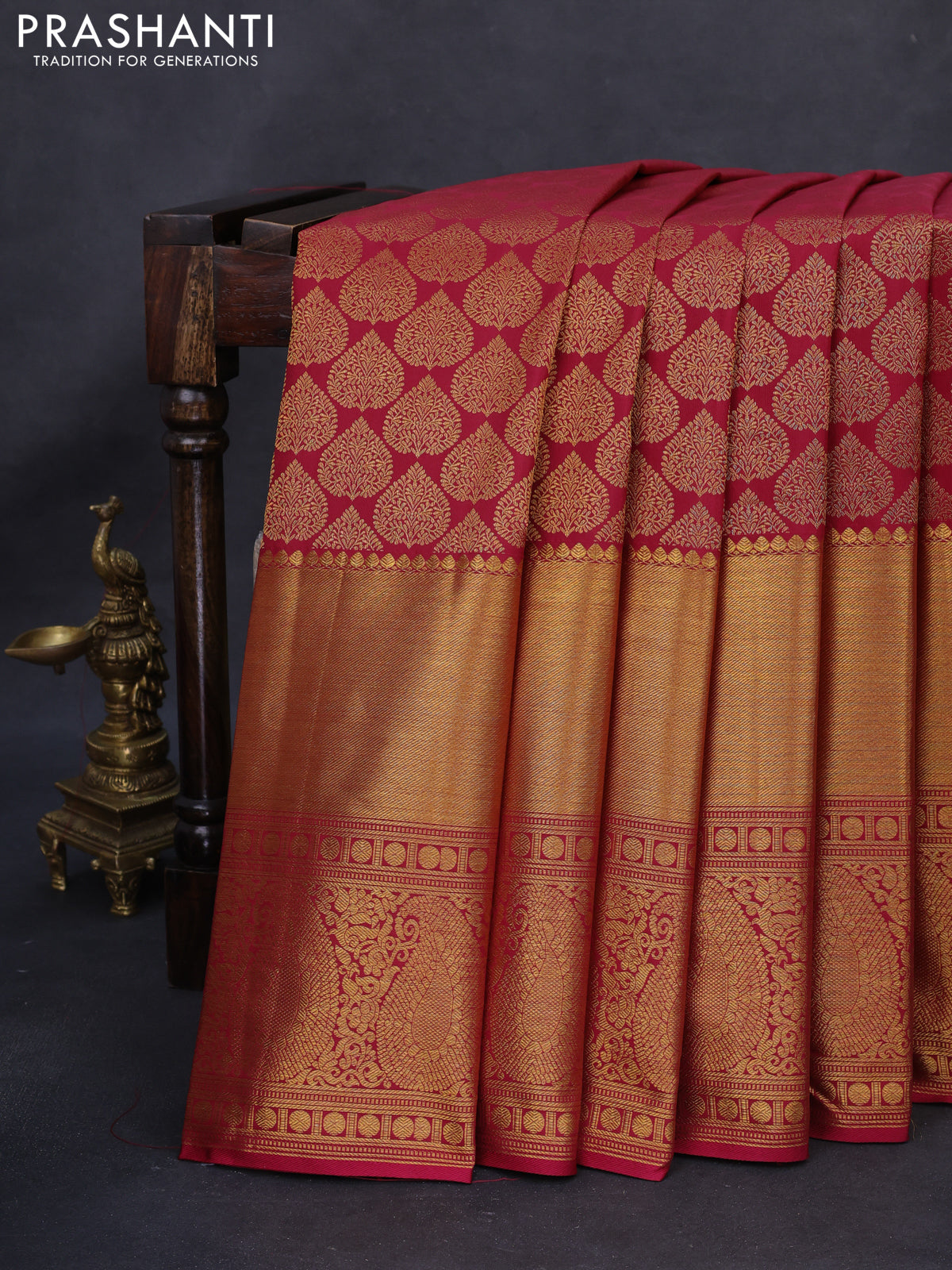 Kanchipuram silk saree maroon with allover zari woven brocade weaves and long rich zari woven border