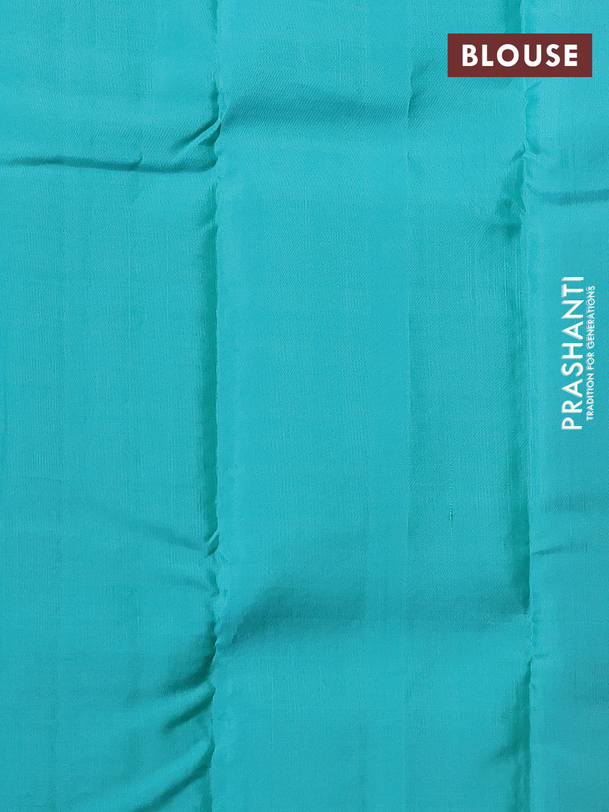 Kanchipuram silk saree mehendi green and teal blue with allover copper zari weaves in borderless style