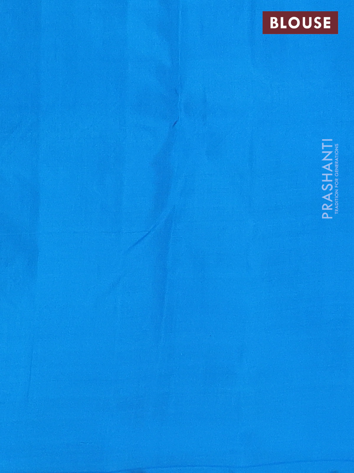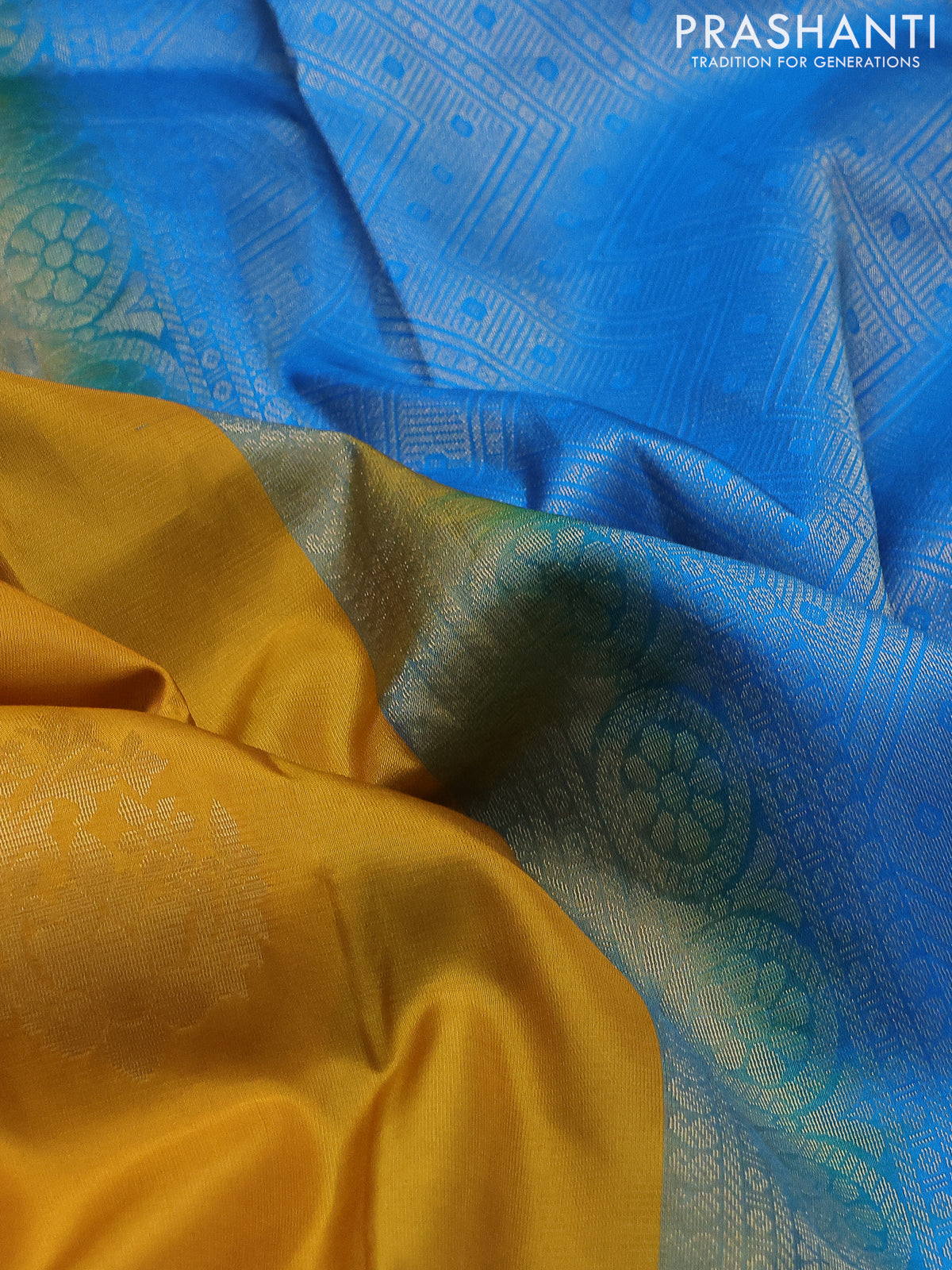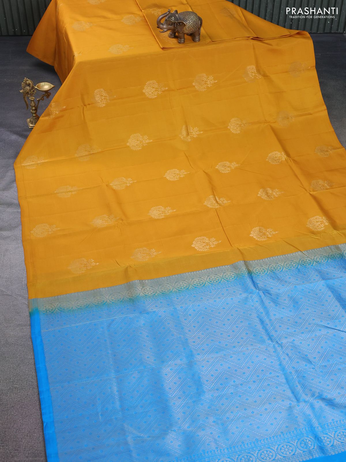 Kanchipuram silk saree mustard yellow and cs blue with zari woven buttas in borderless style