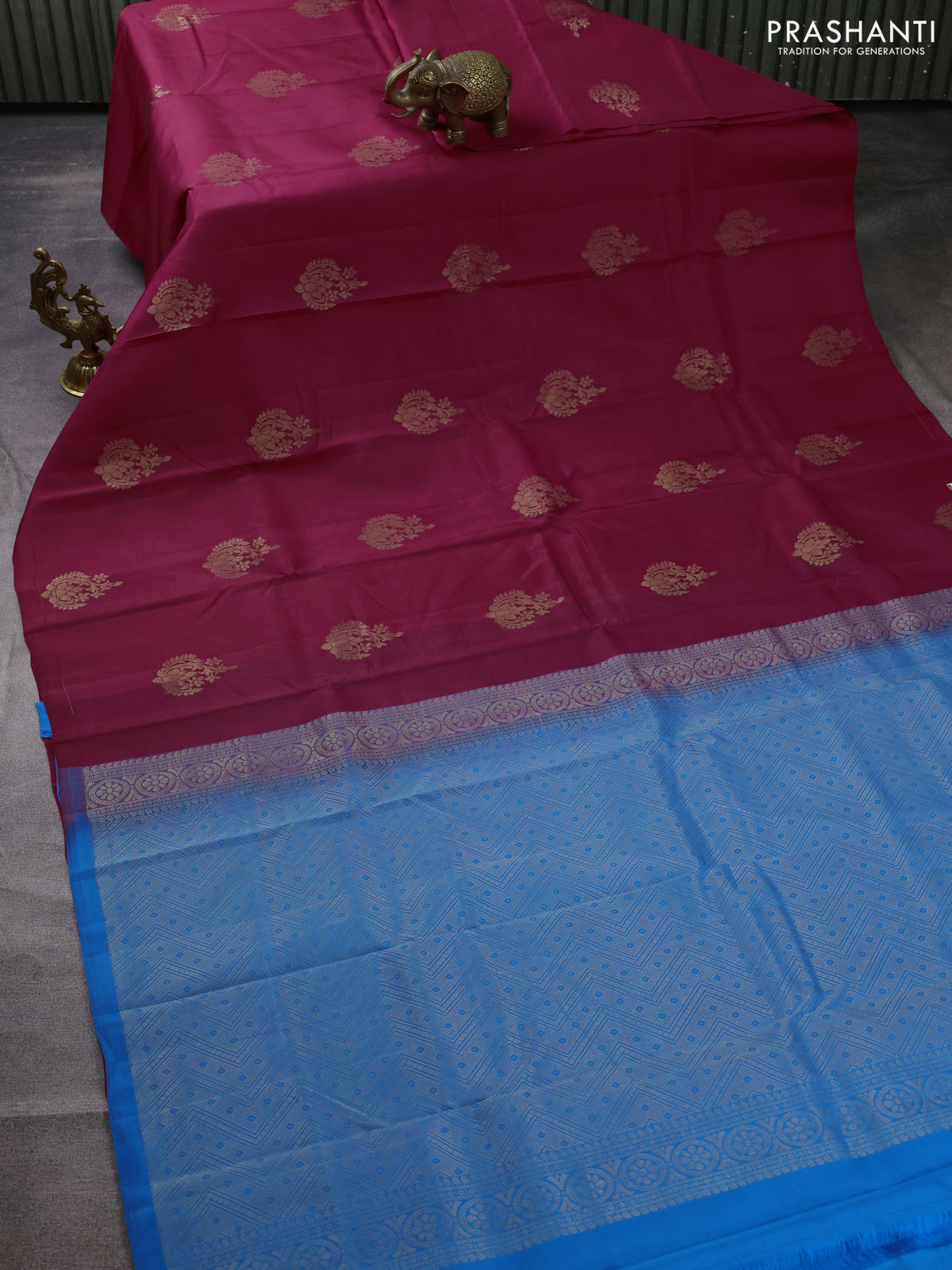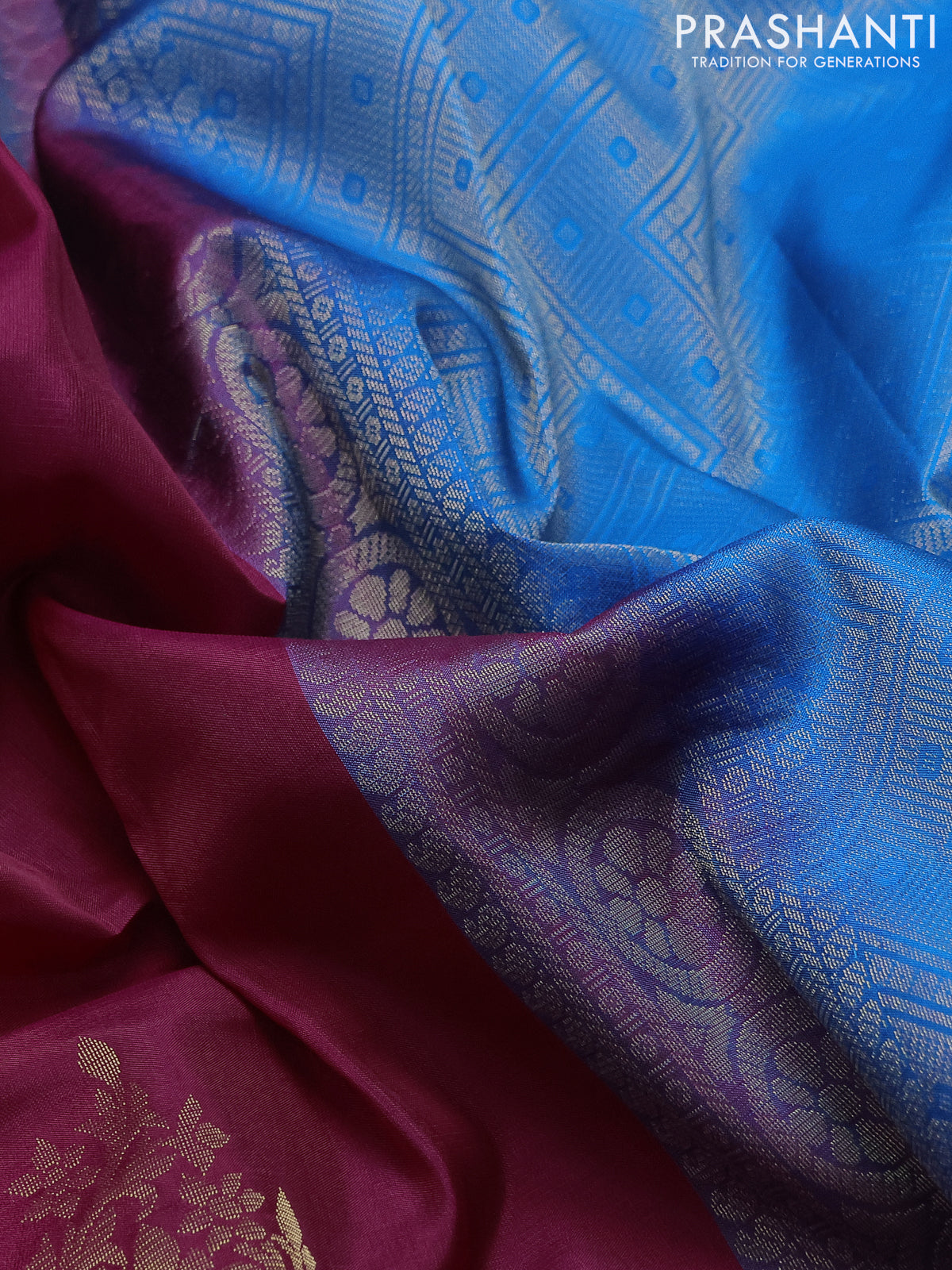 Kanchipuram silk saree pink and cs blue with zari woven buttas in borderless style