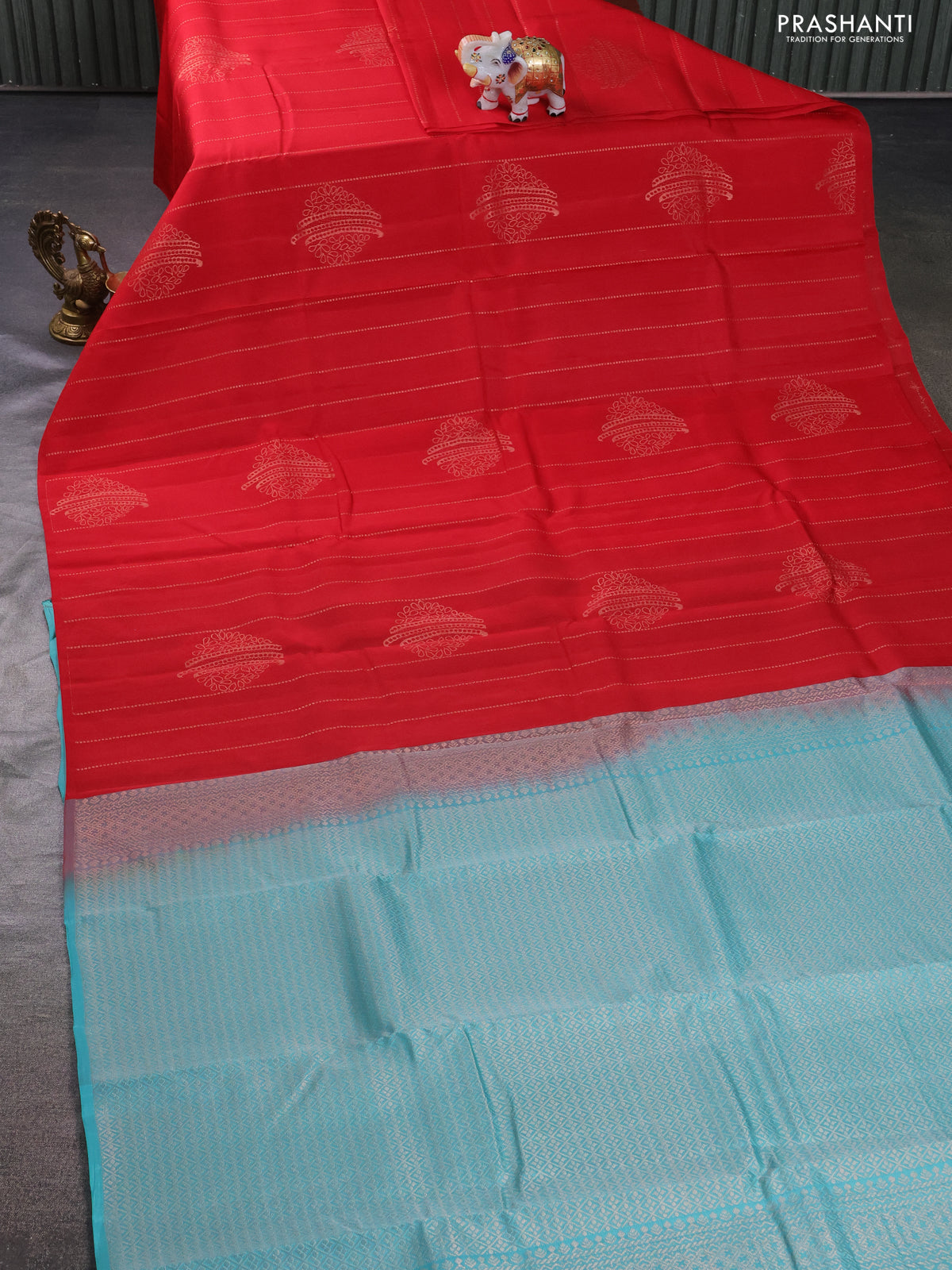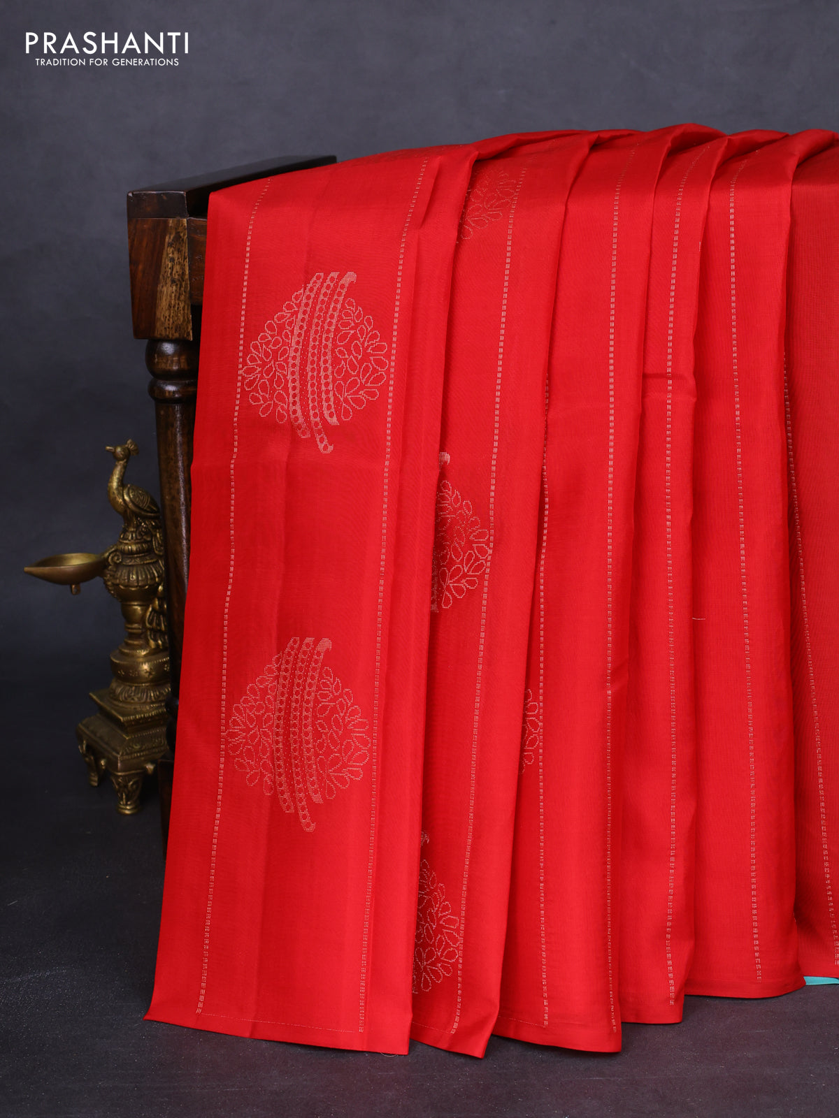 Kanchipuram silk saree red and teal blue with allover zari weaves & buttas in borderless style