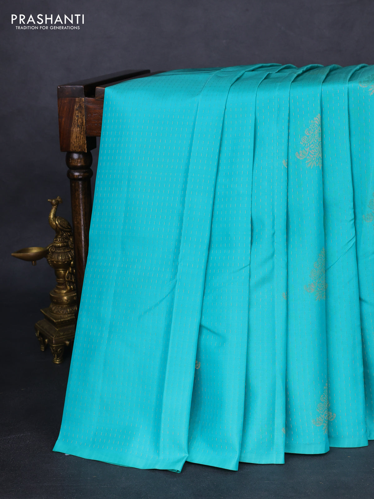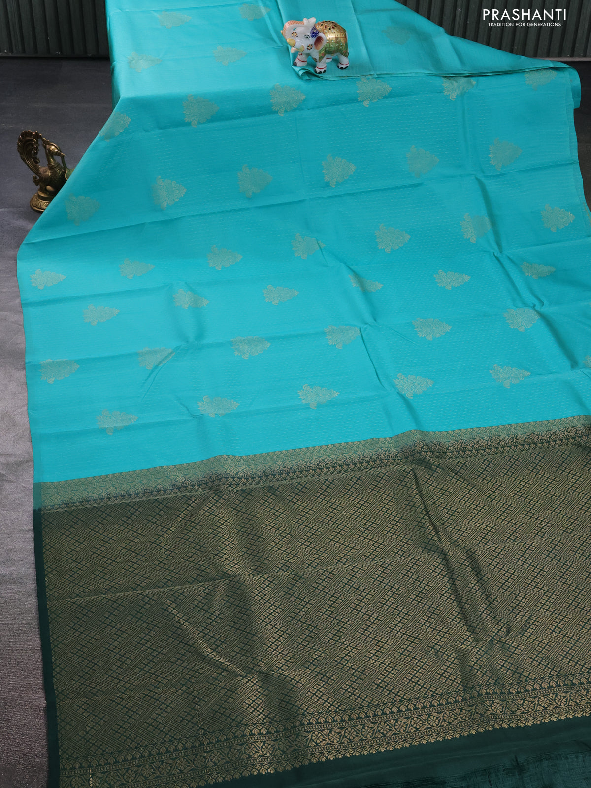 Kanchipuram silk saree teal blue and bottle green with allover zari weaves in borderless style