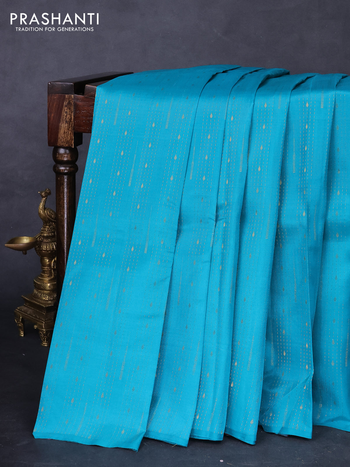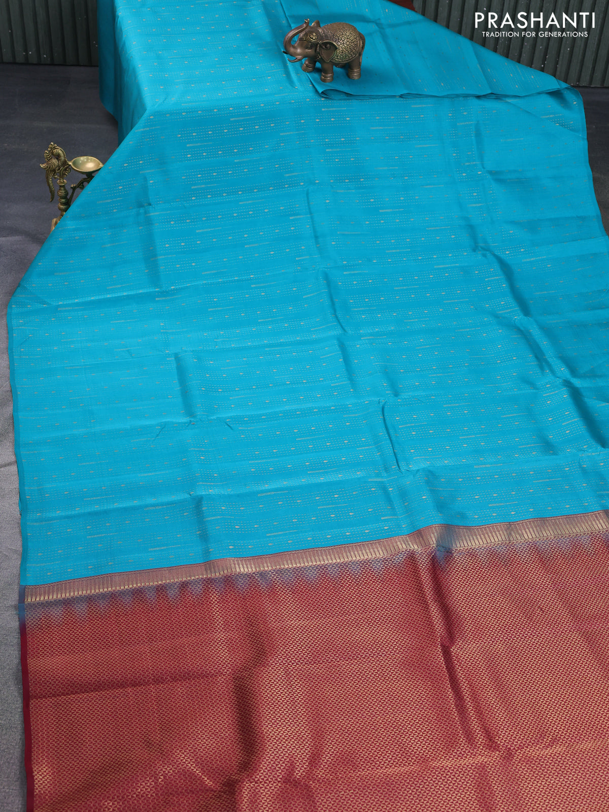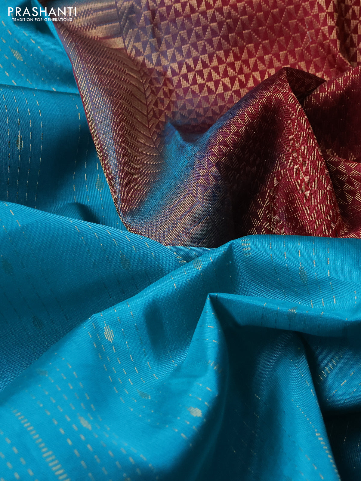 Kanchipuram silk saree teal blue and maroon with allover zari weaves in borderless style