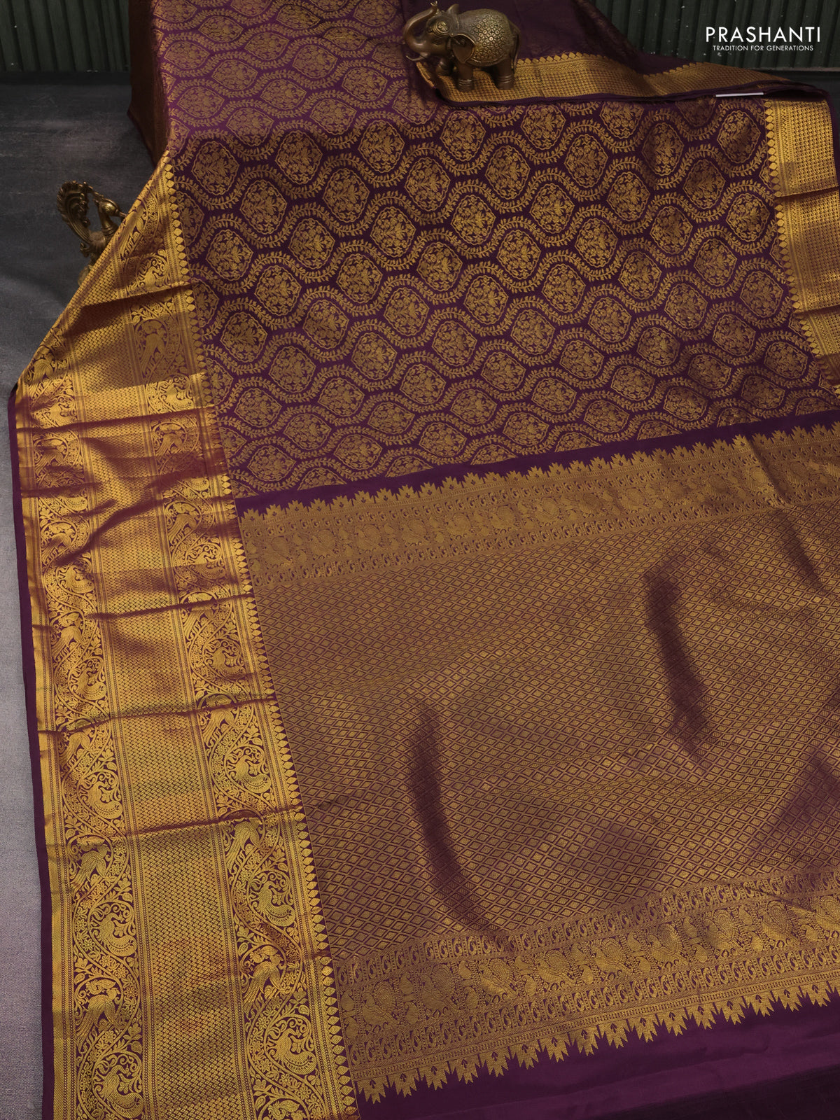 Kanchipuram silk saree wine shade with allover zari woven brocade weaves and long rich zari woven border
