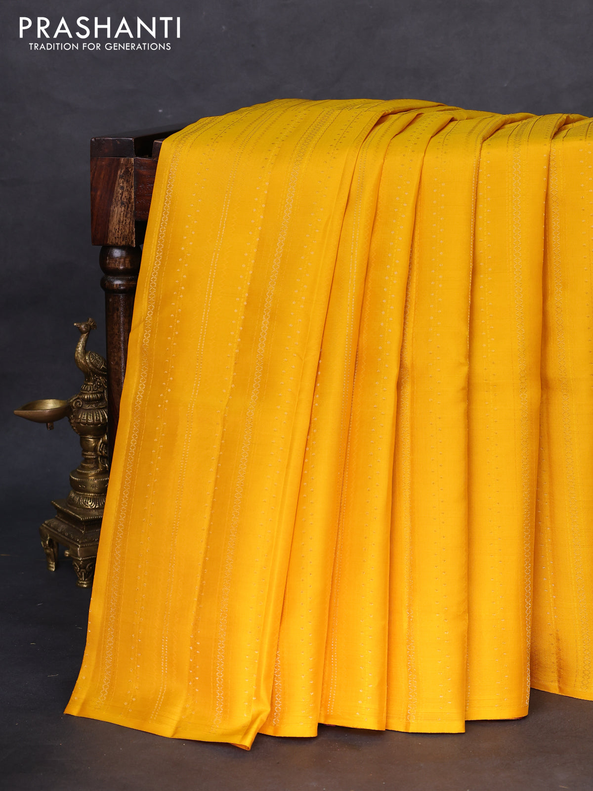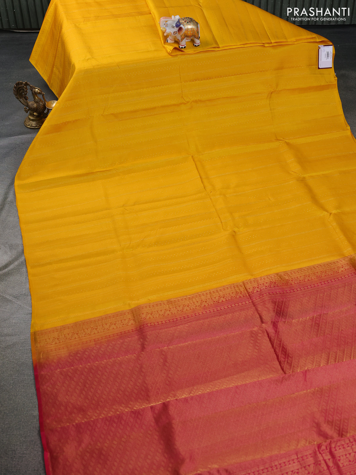 Kanchipuram silk saree yellow and dark pink with allover self emboss & zari weaves in borderless style