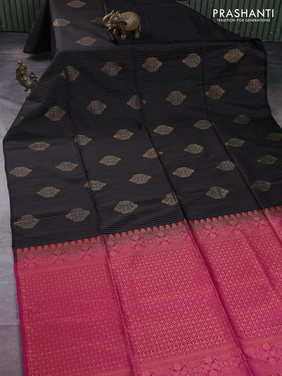 Kanchipuram soft silk saree black and pink with allover zari weaves & buttas in borderless style