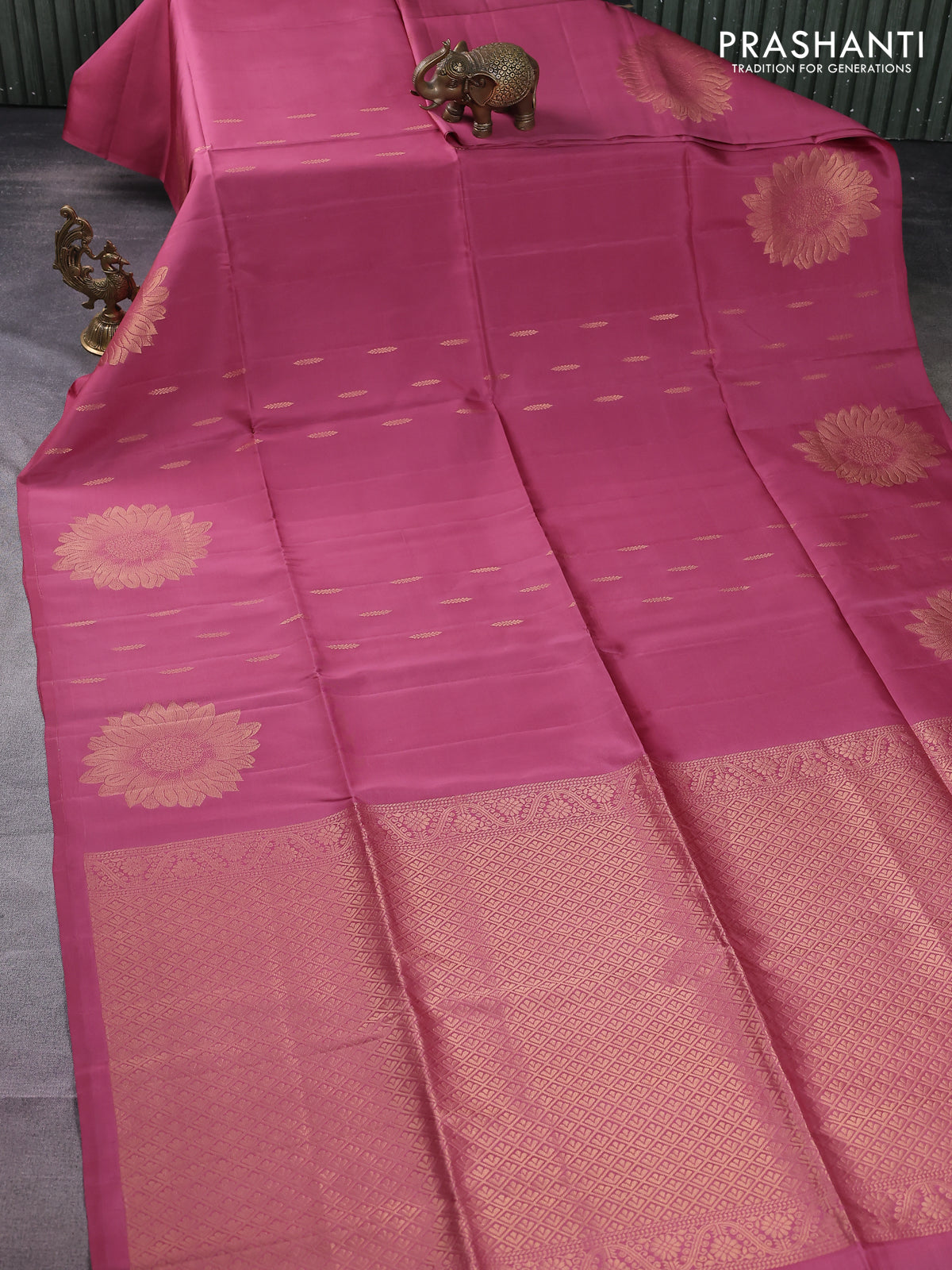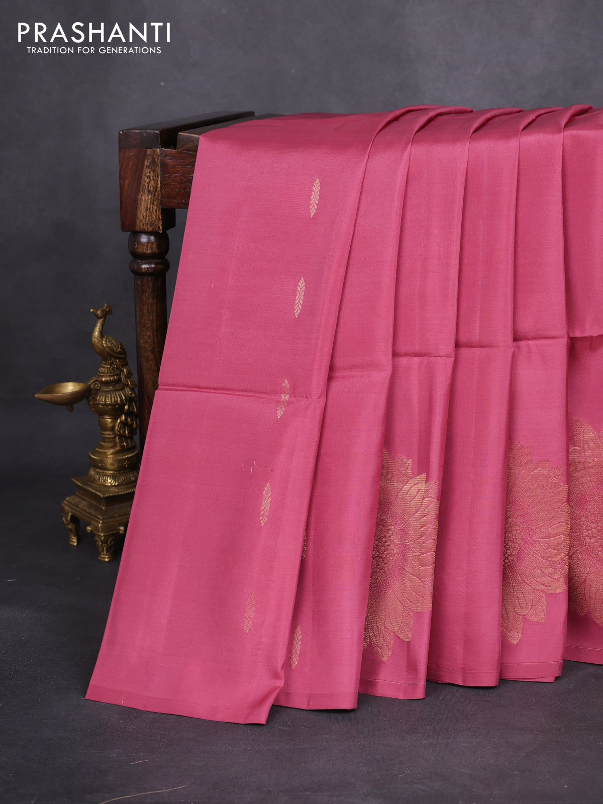 Kanchipuram soft silk saree dark peach with allover zari woven buttas and zari woven floral butta border