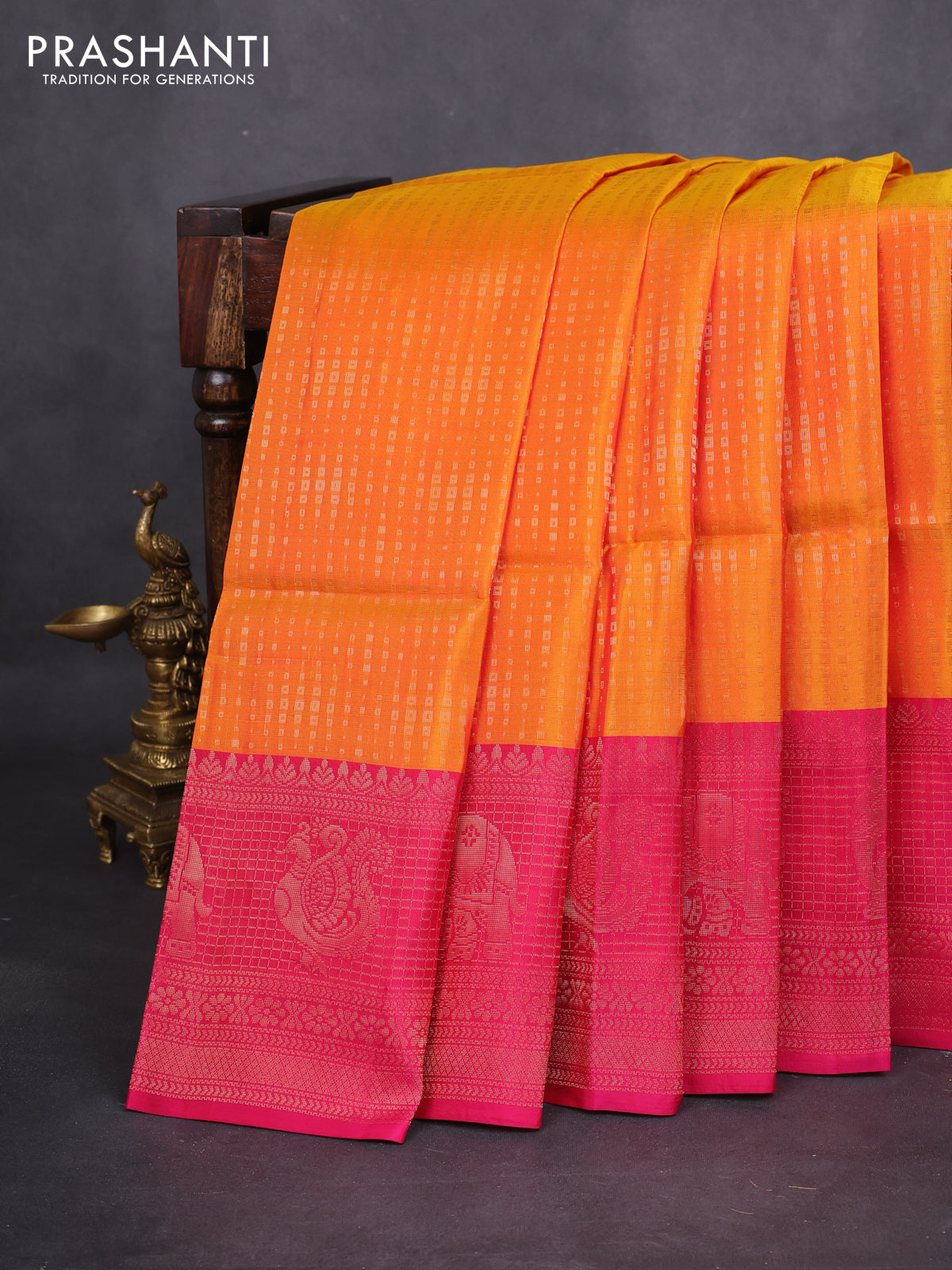 Kanchipuram soft silk saree dual shade of mango yellow and pink with allover zari woven brocdae weaves and long zari woven border