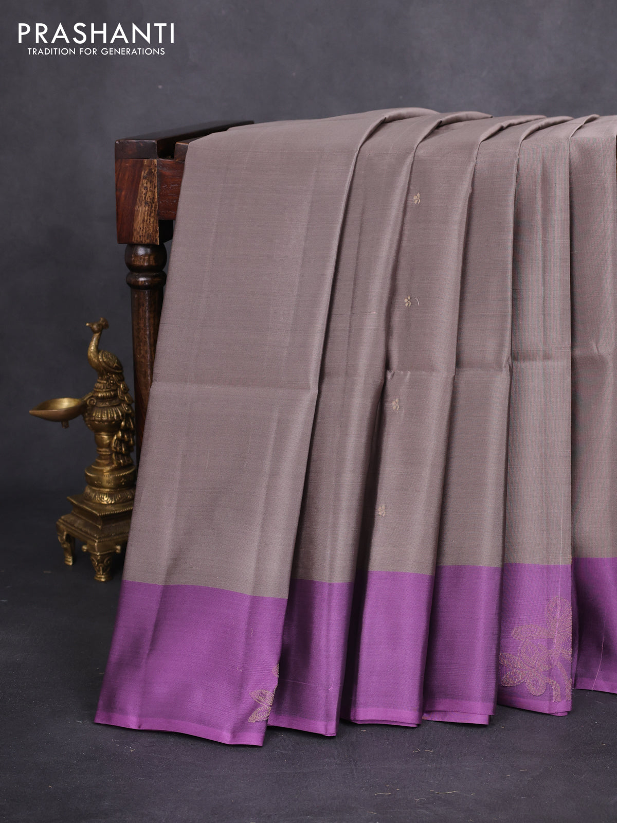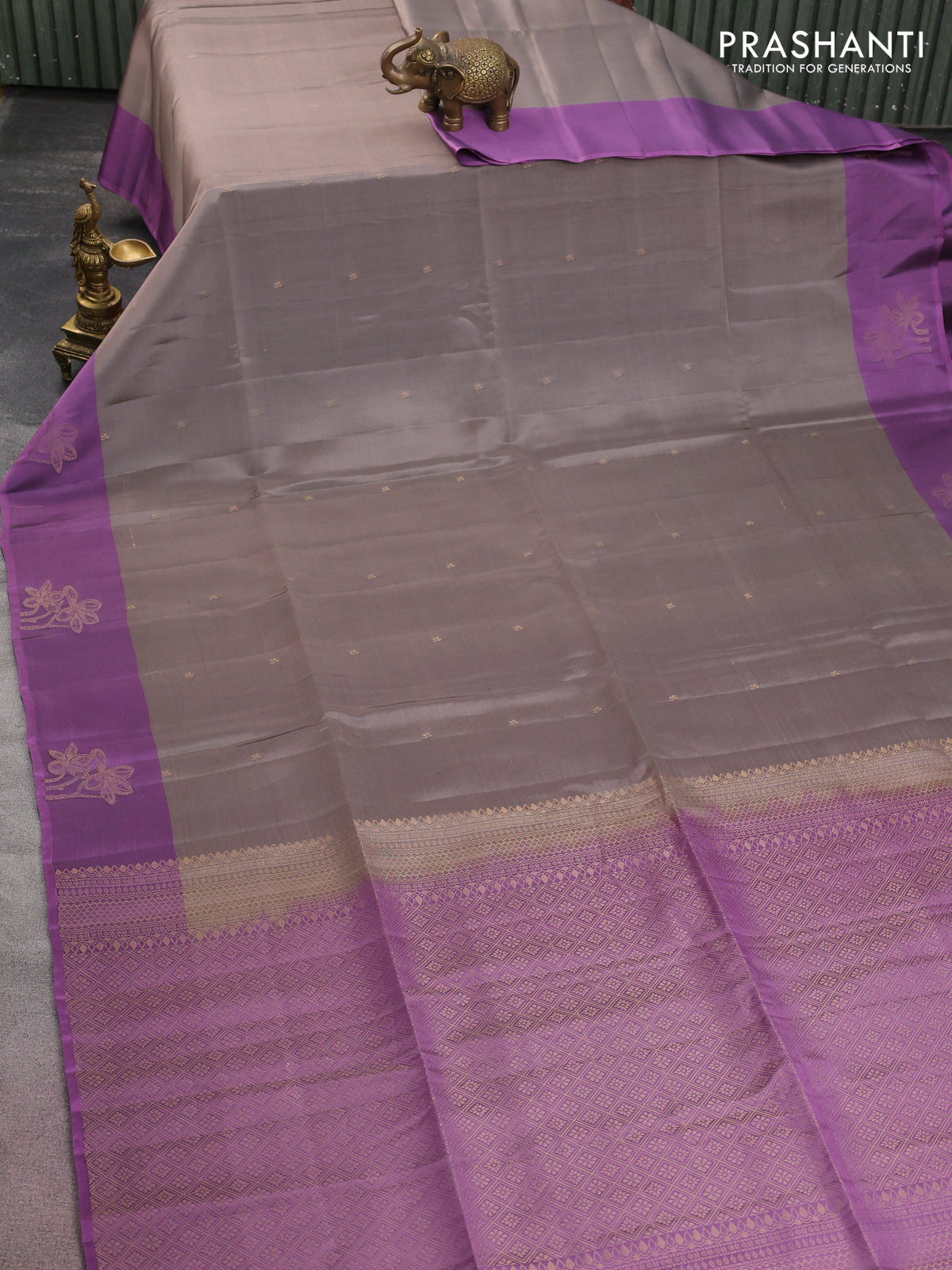 Kanchipuram soft silk saree grey and lavender shade with zari woven buttas and zari woven butta border
