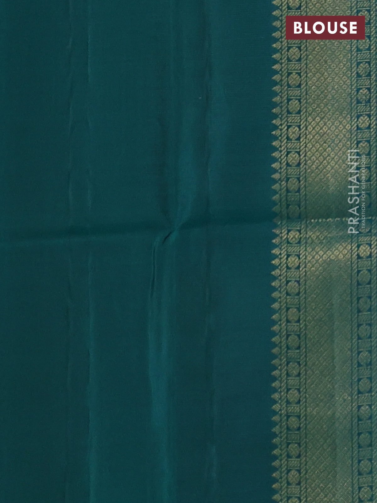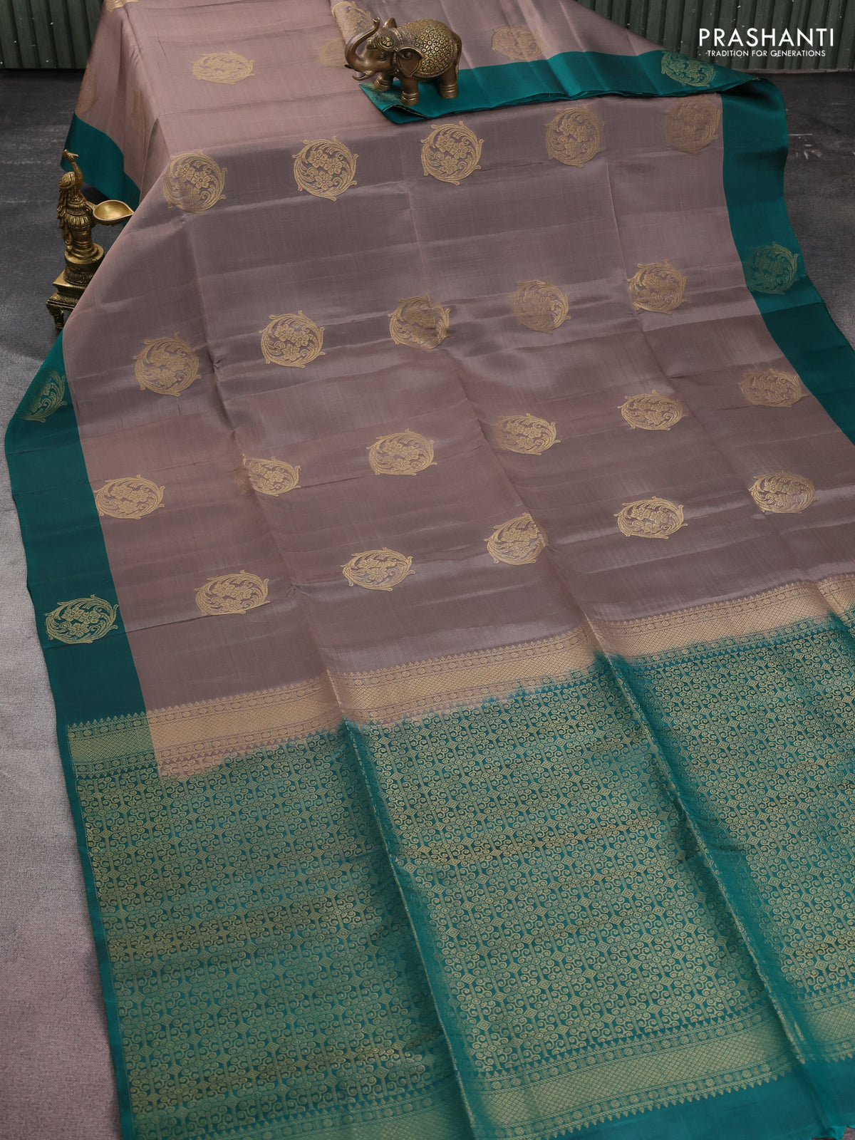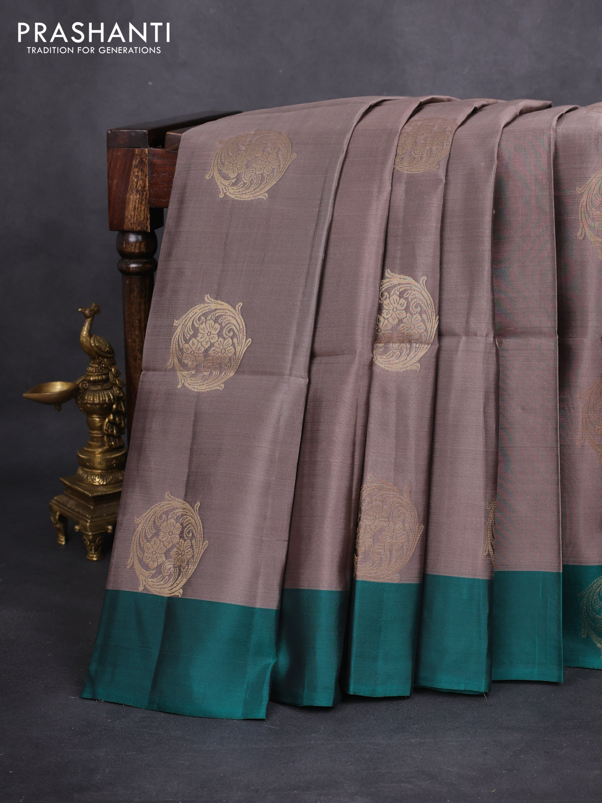 Kanchipuram soft silk saree grey and teal green with zari woven buttas and zari woven butta border