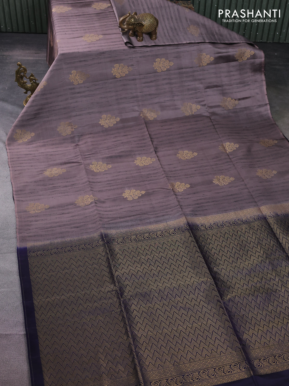 Kanchipuram soft silk saree grey shade and dark blue with zari buttas & jute finish in borderless style