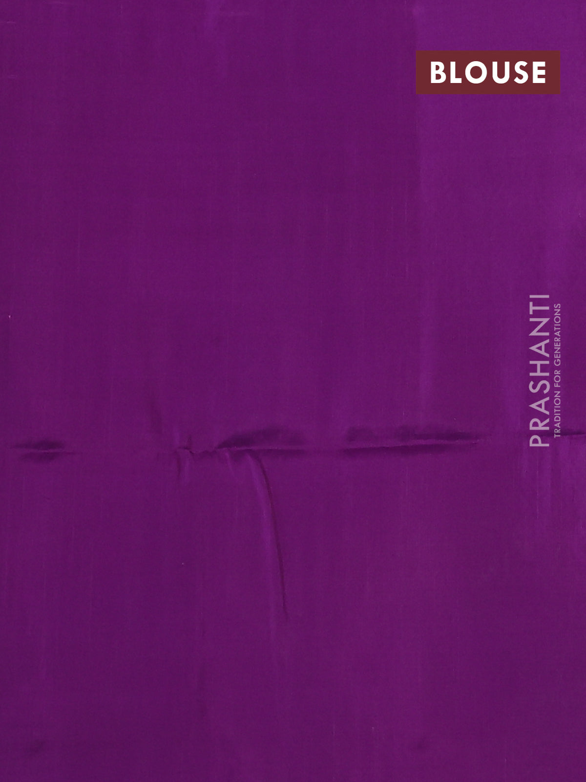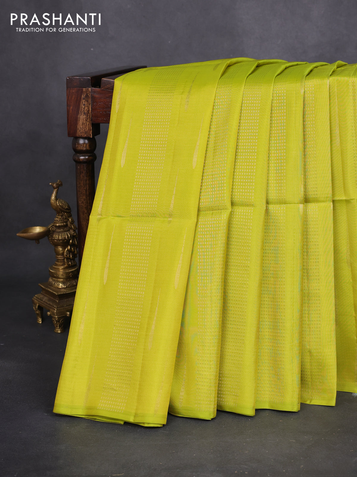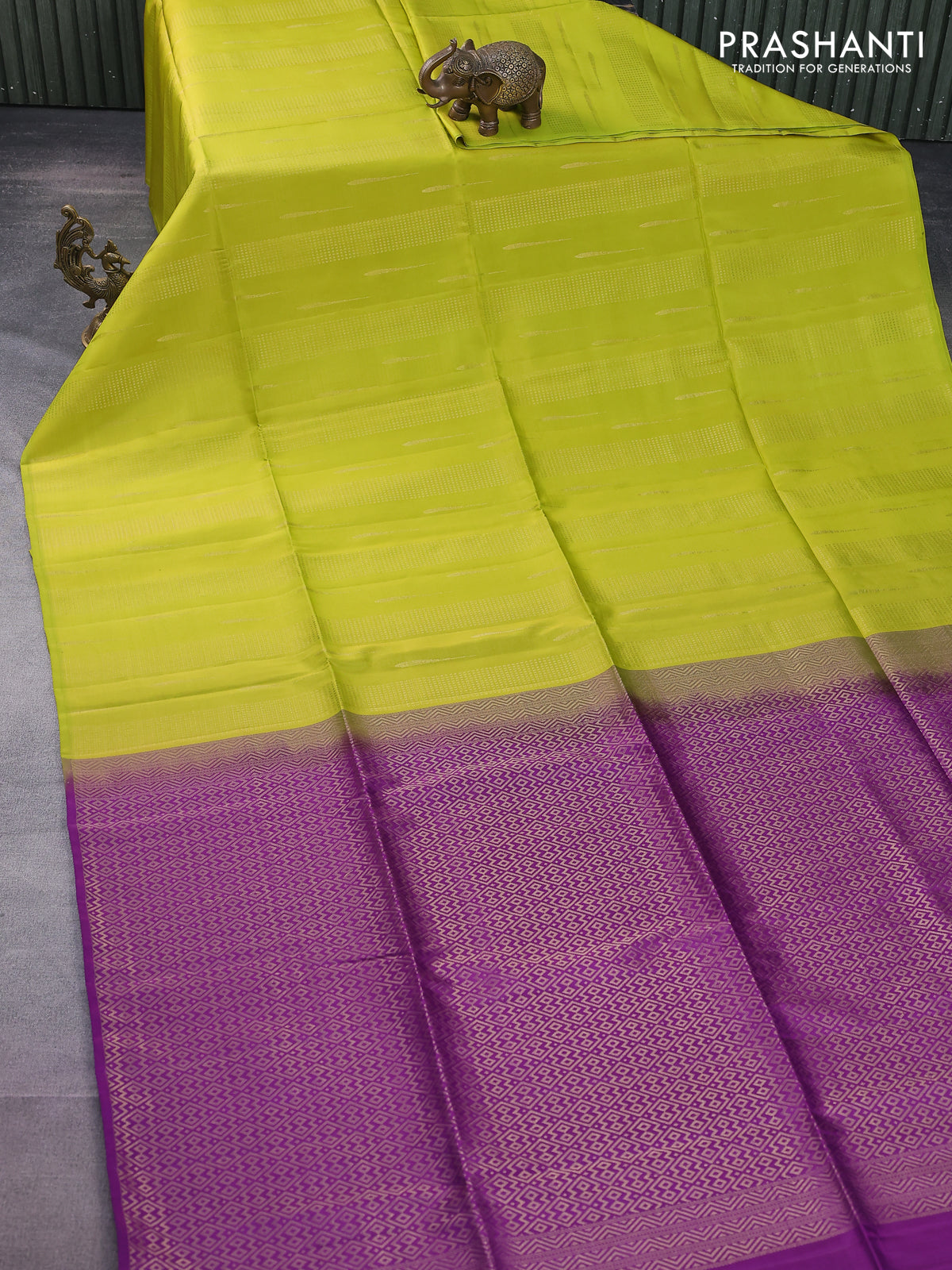 Kanchipuram soft silk saree lime green and purple with allover zari weaves & buttas in borderless style