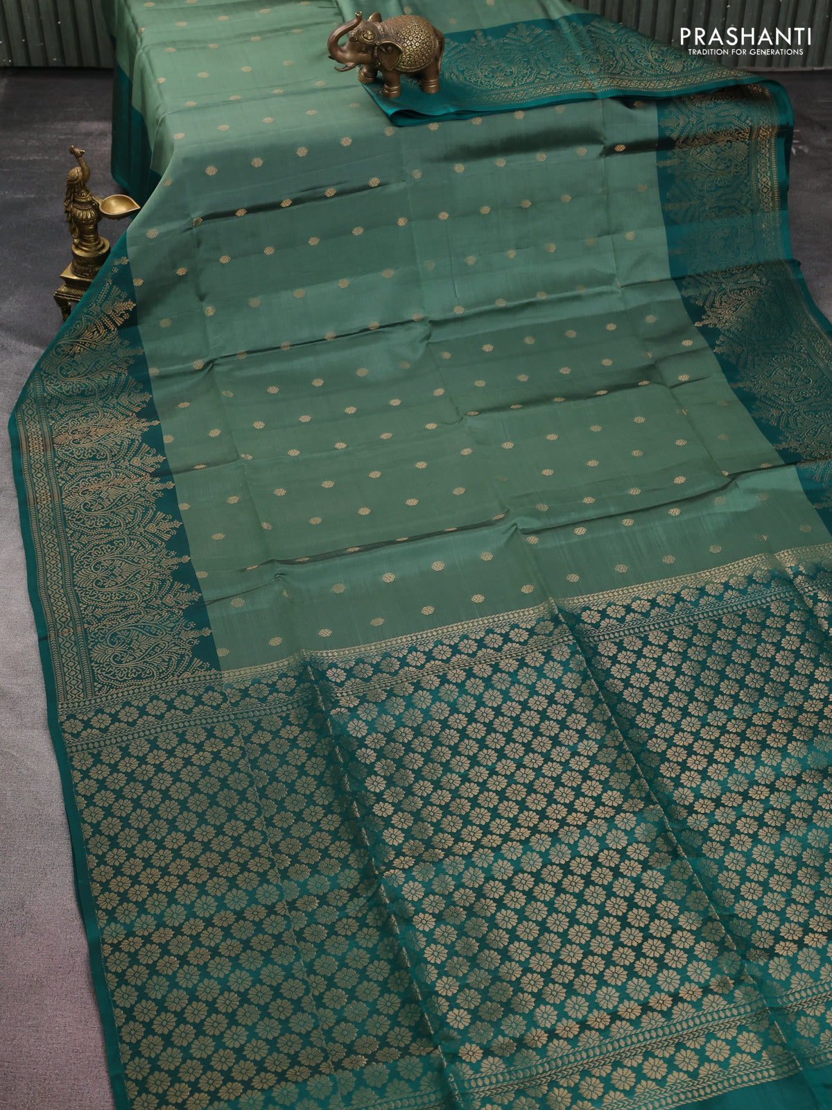 Kanchipuram soft silk saree pastel green shade and teal green with zari woven buttas and long zari woven border