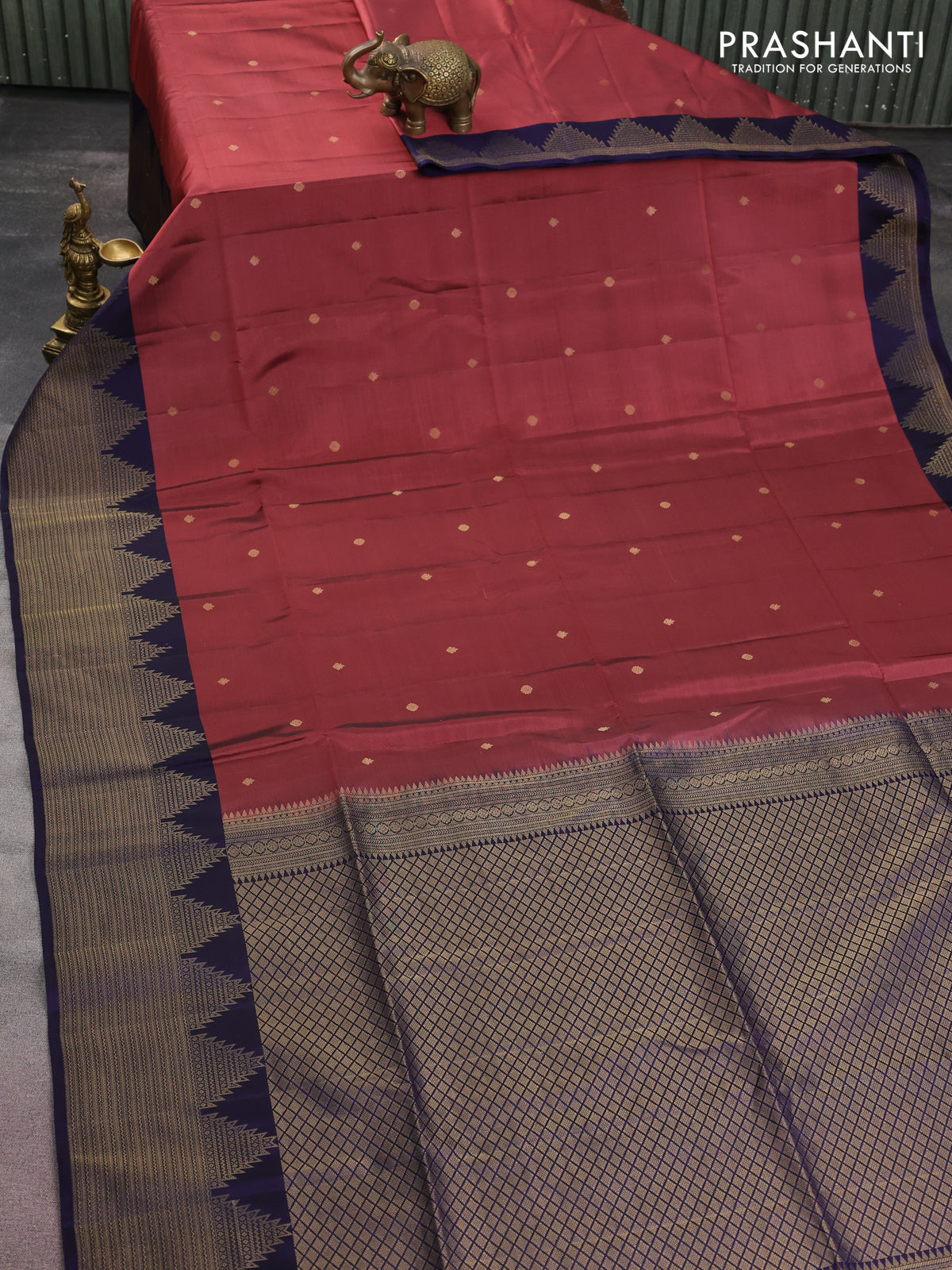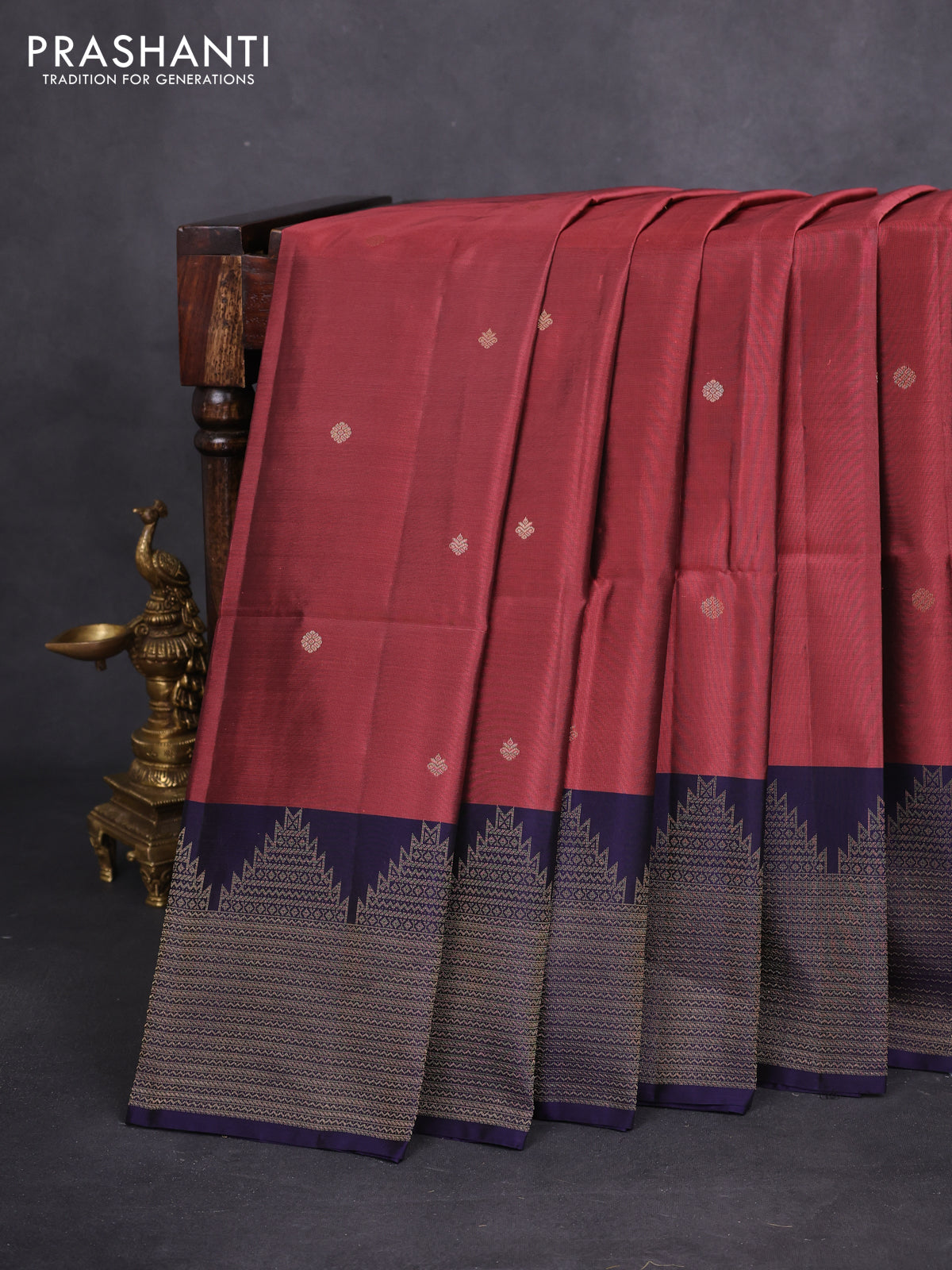 Kanchipuram soft silk saree pastel maroon and dark blue with zari woven buttas and temple zari woven border