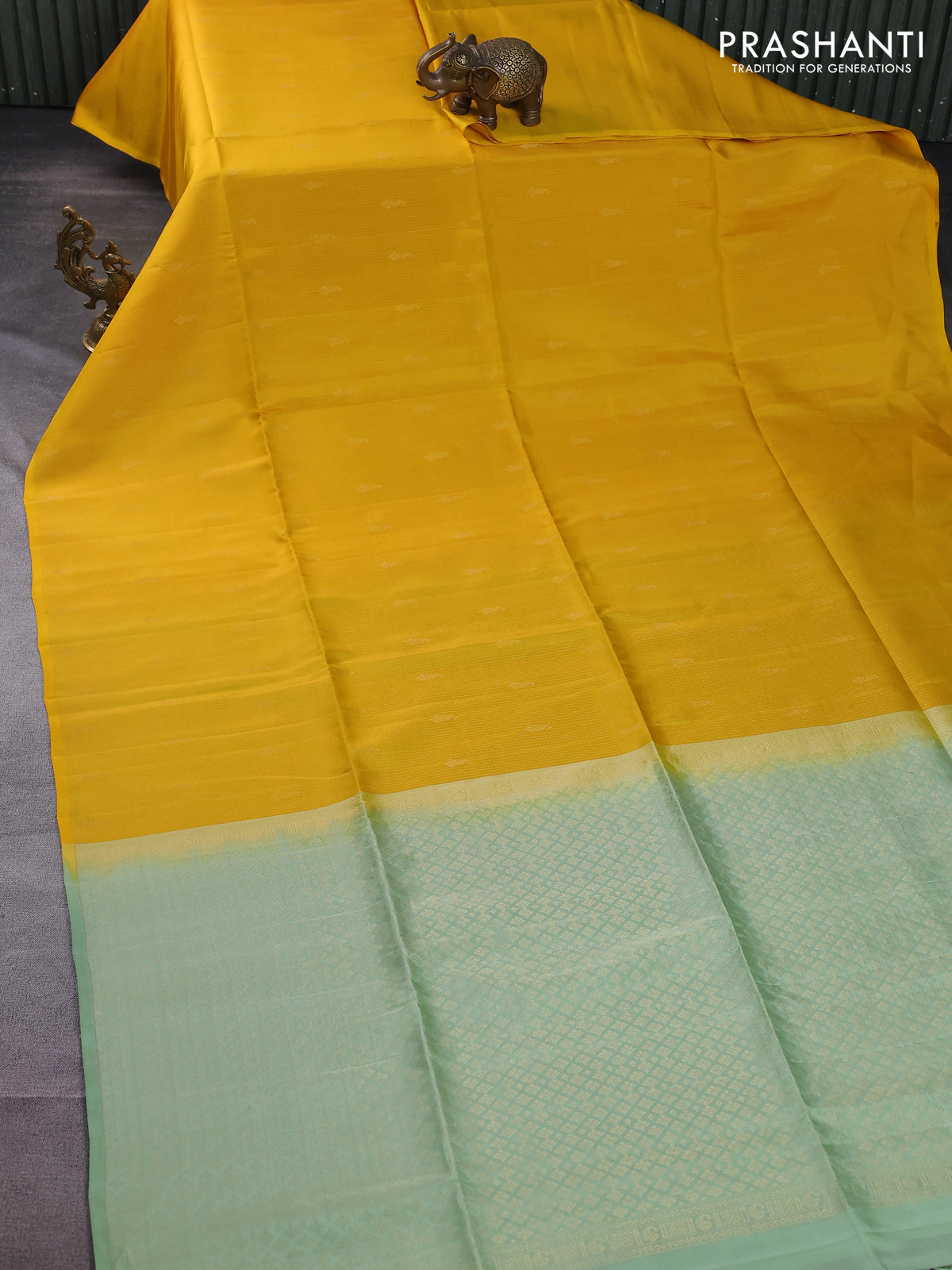 Kanchipuram soft silk saree yellow and pastel green with allover zari weaves in borderless style