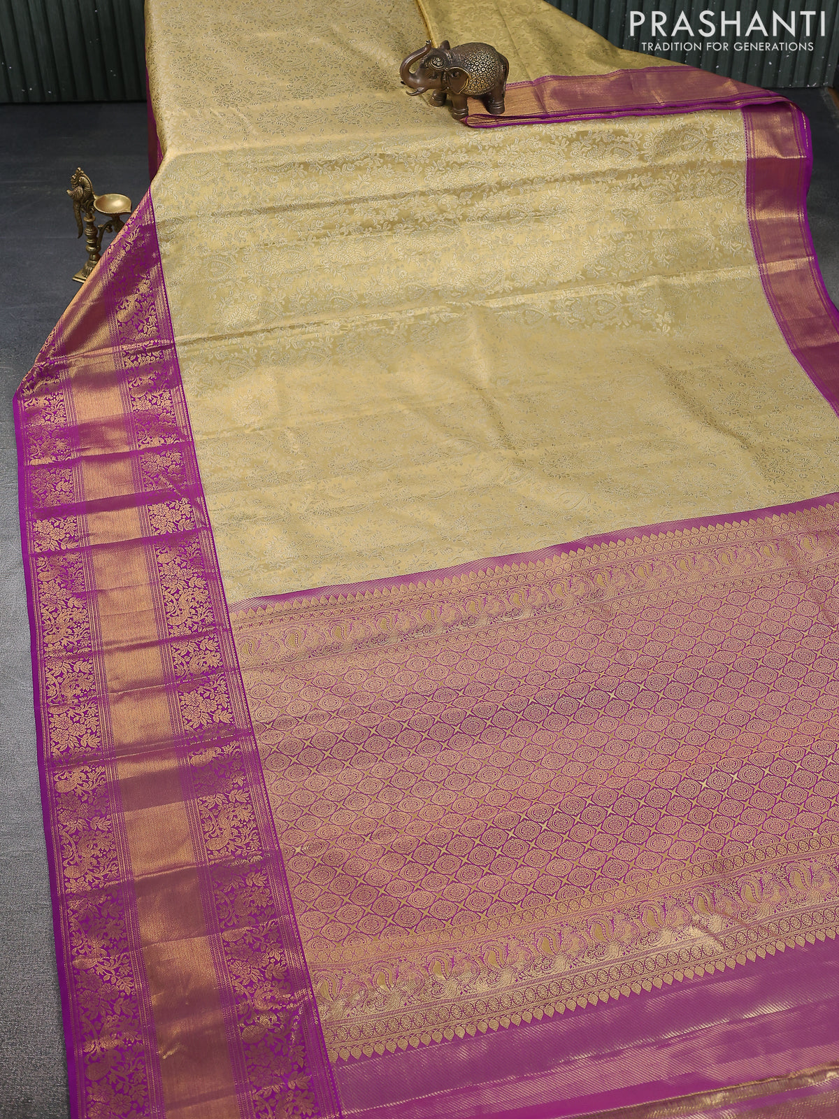 Kanchipuram tissue silk saree sandal and purple with allover zari woven brocade weaves and long zari woven border