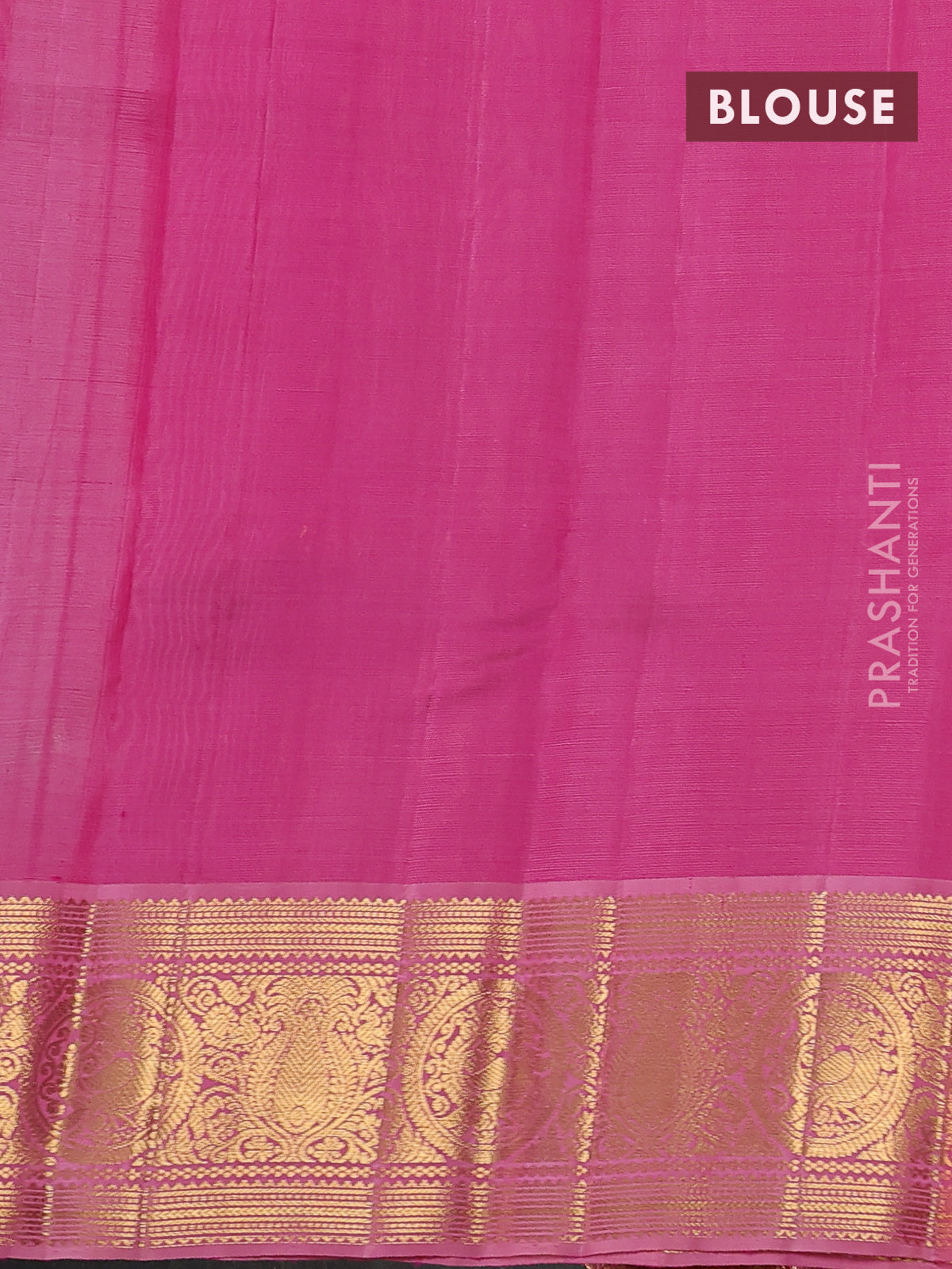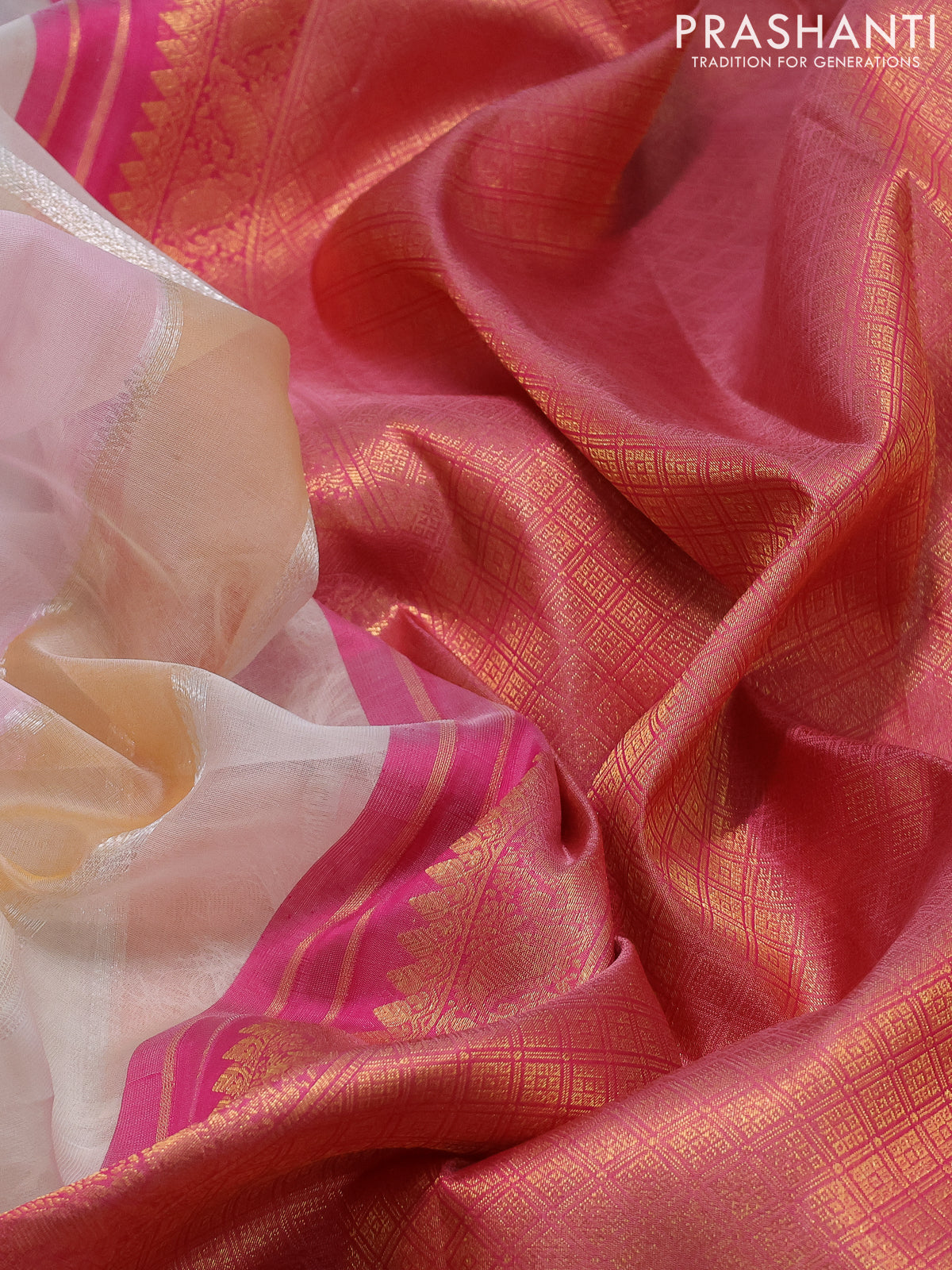 Kora kanchipuram silk saree multi colour and peach pink with allover silver zari stripes pattern and zari woven border