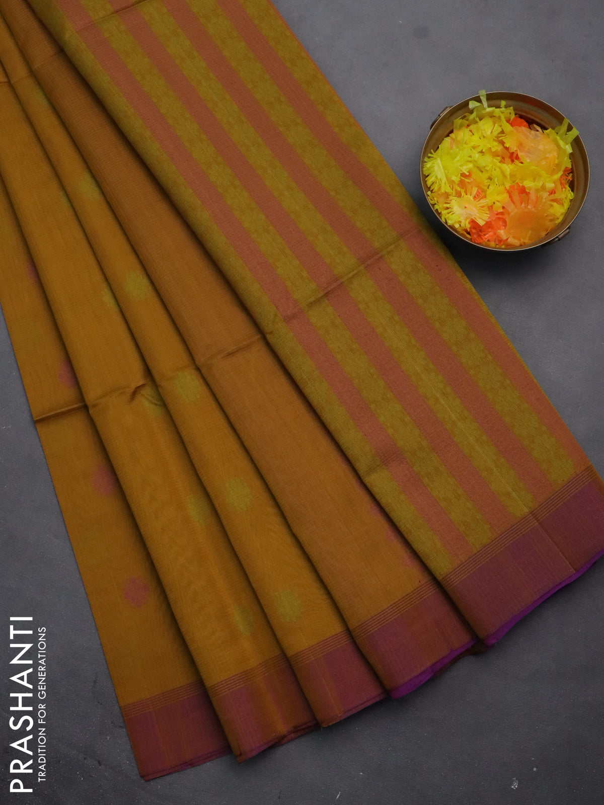 Kora silk cotton saree dark mustard and purple with thread woven buttas and simple border