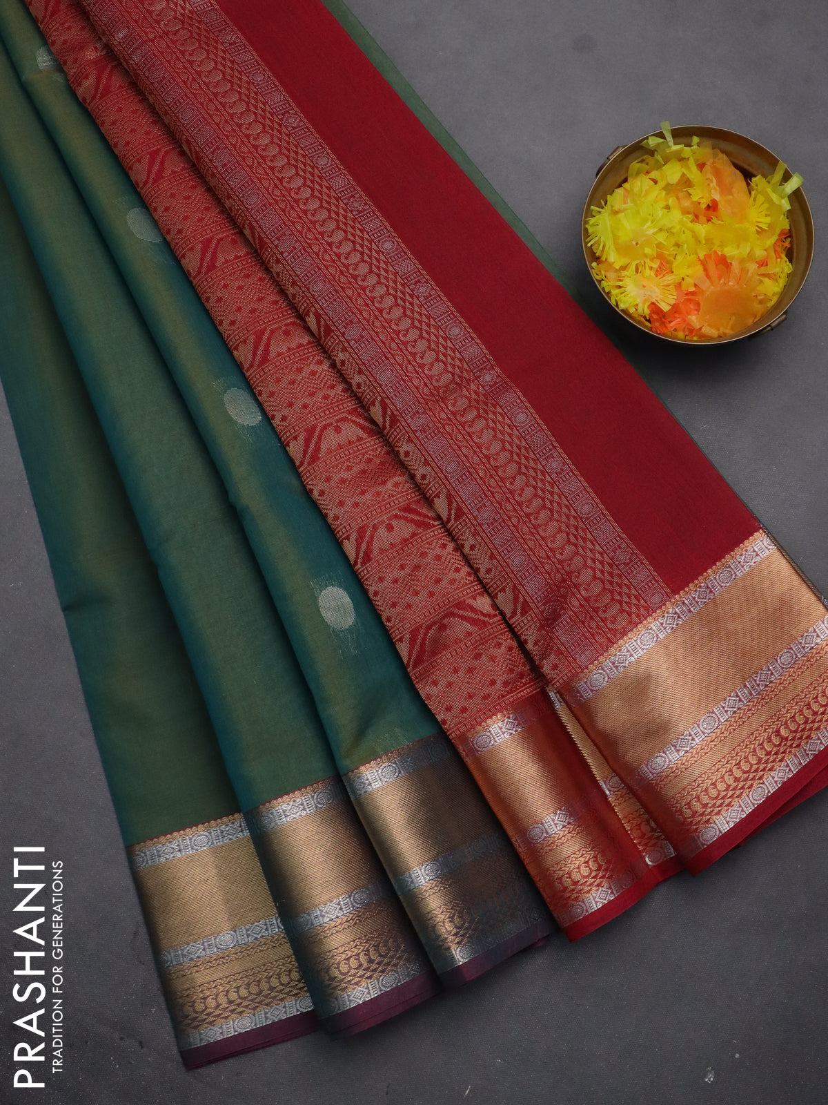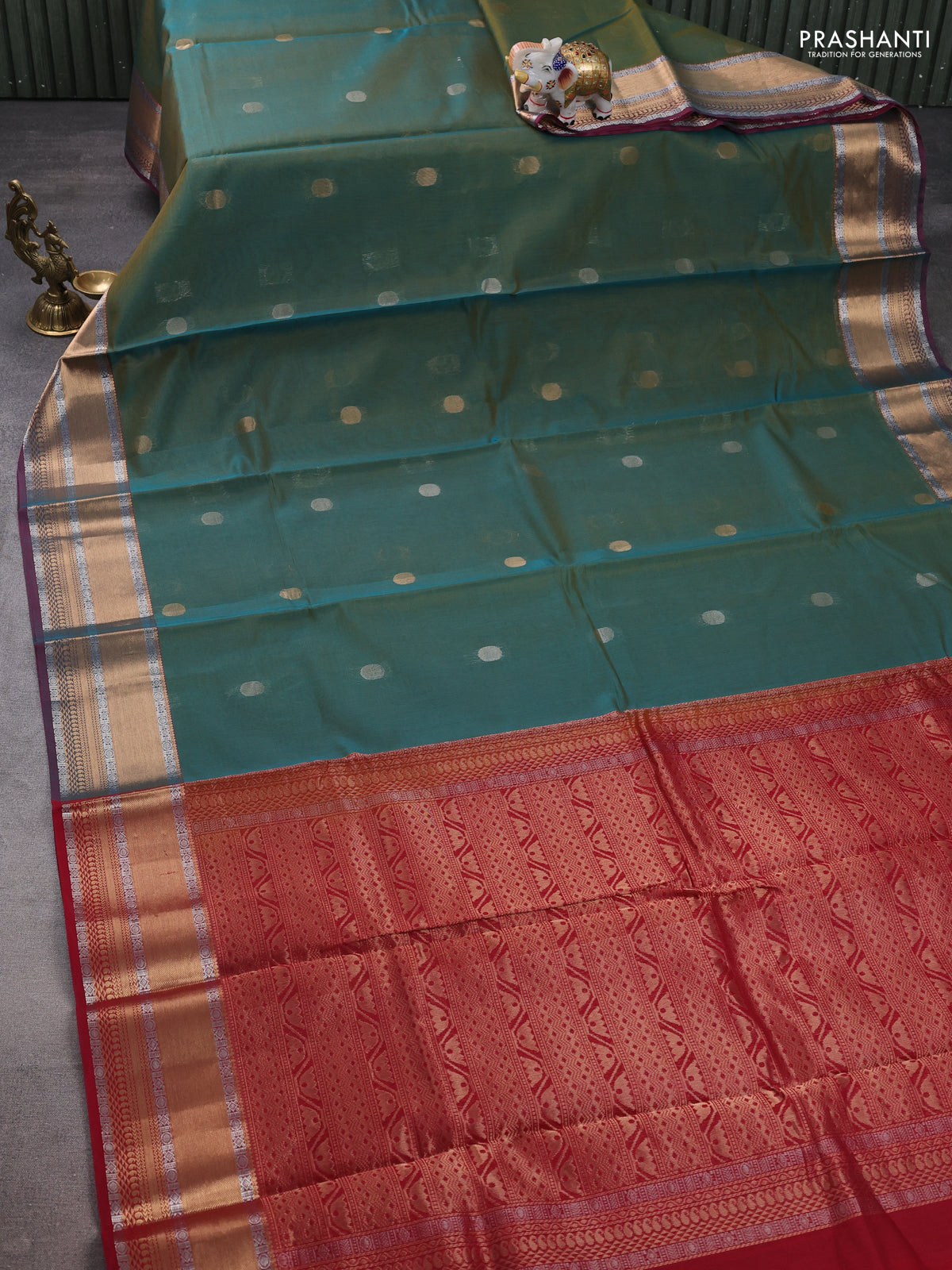 Kora silk cotton saree dual shade of mustard yellowish teal and pink with silver & gold zari woven geometric buttas and zari woven border